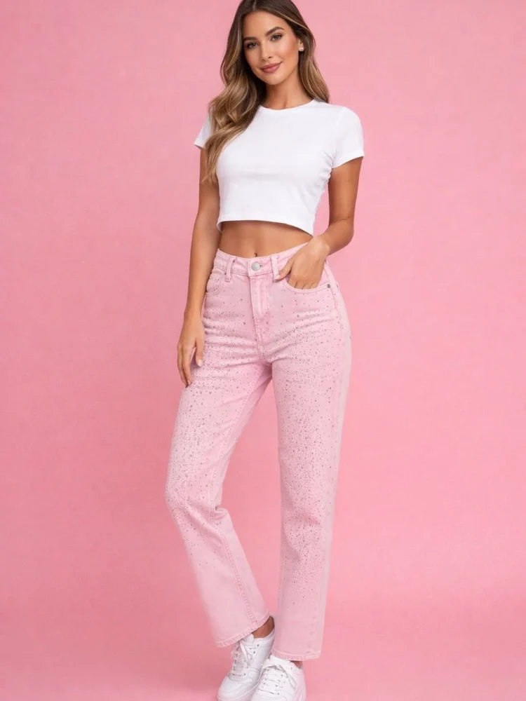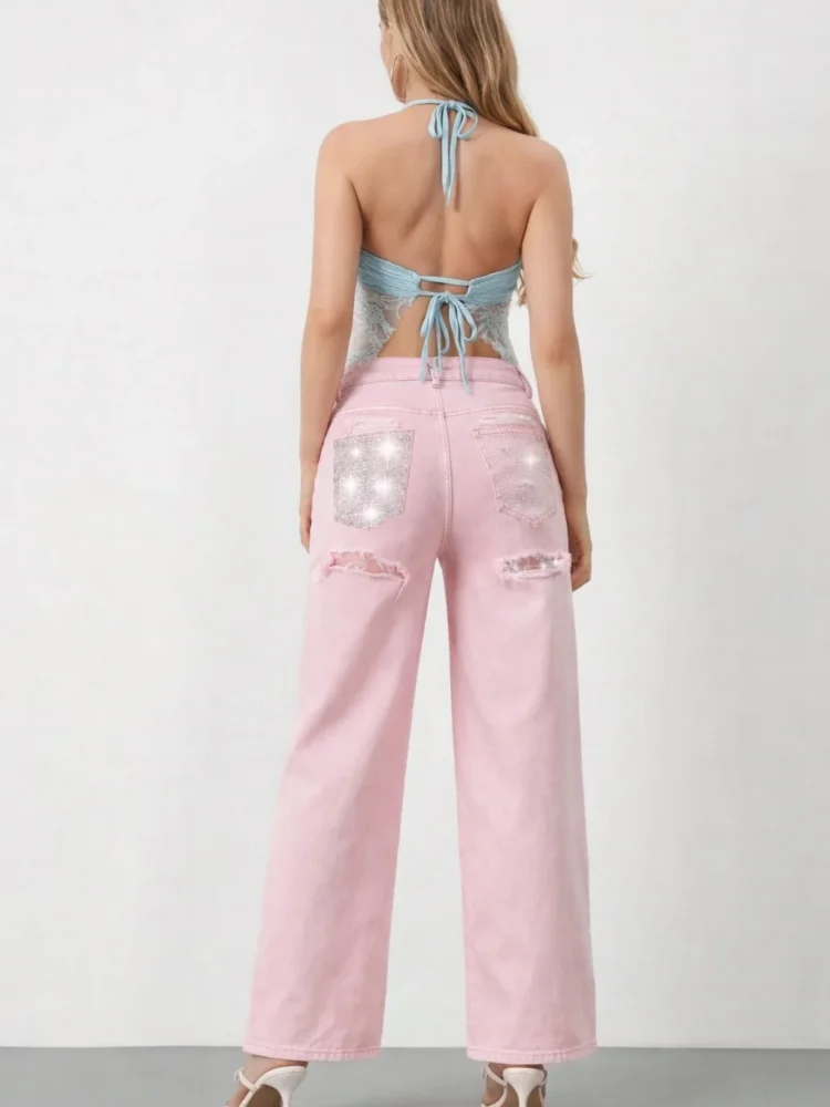 Pink Floral Denim Wide Leg Pants