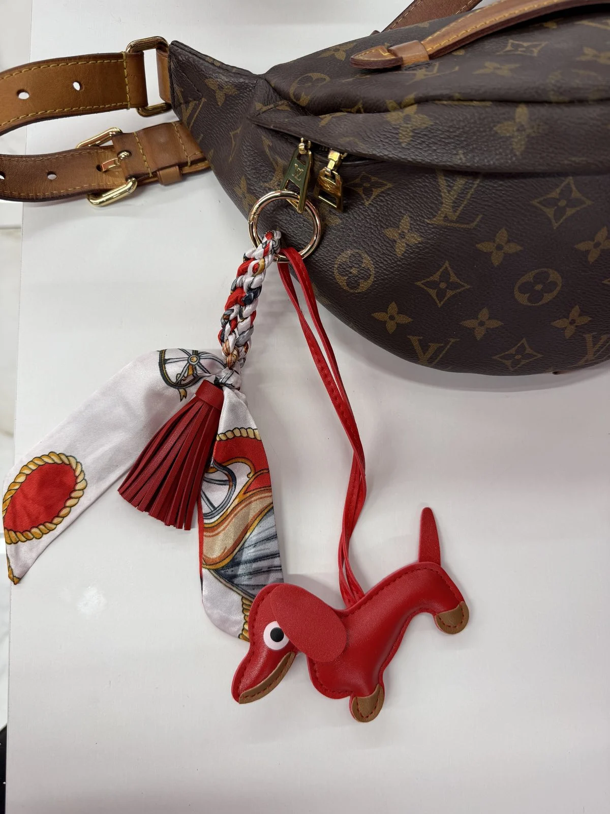 Ένα χαριτωμένο κόκκινο σκυλάκι dachshund με δερμάτινες λεπτομέρειες και εντυπωσιακό φουλάρι σε κόκκινο-λευκό print. Μοναδικό αξεσουάρ που κλέβει την παράσταση.