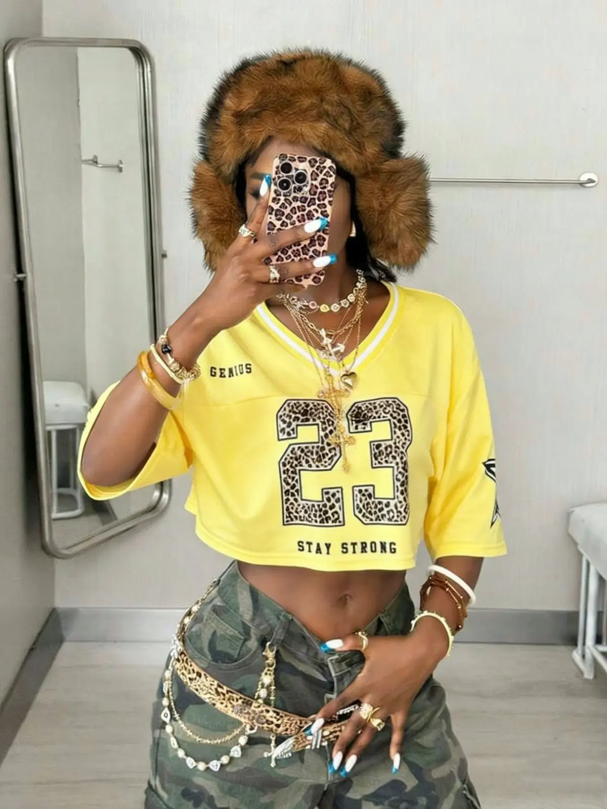 Στυλάτο crop top με αθλητική αισθητική και εντυπωσιακό leopard σχέδιο στο νούμερο 23. Διαθέτει V λαιμόκοψη και άνετη γραμμή που χαρίζει μοντέρνο και δυναμικό look. Ιδανικό για καθημερινά outfits και street style εμφανίσεις, συνδυάζεται τέλεια με jeans, cargo παντελόνια ή σορτσάκια.