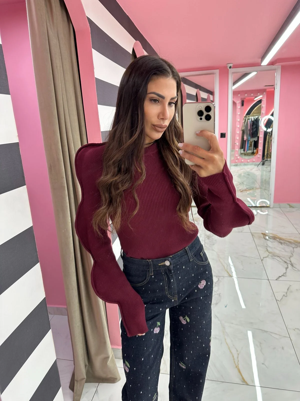 Εντυπωσιακό μπορντό πλεκτό με sculpted μανίκια που δίνουν δυναμισμό και θηλυκότητα. Ιδανικό για εμφανίσεις που θέλουν να ξεχωρίζουν.