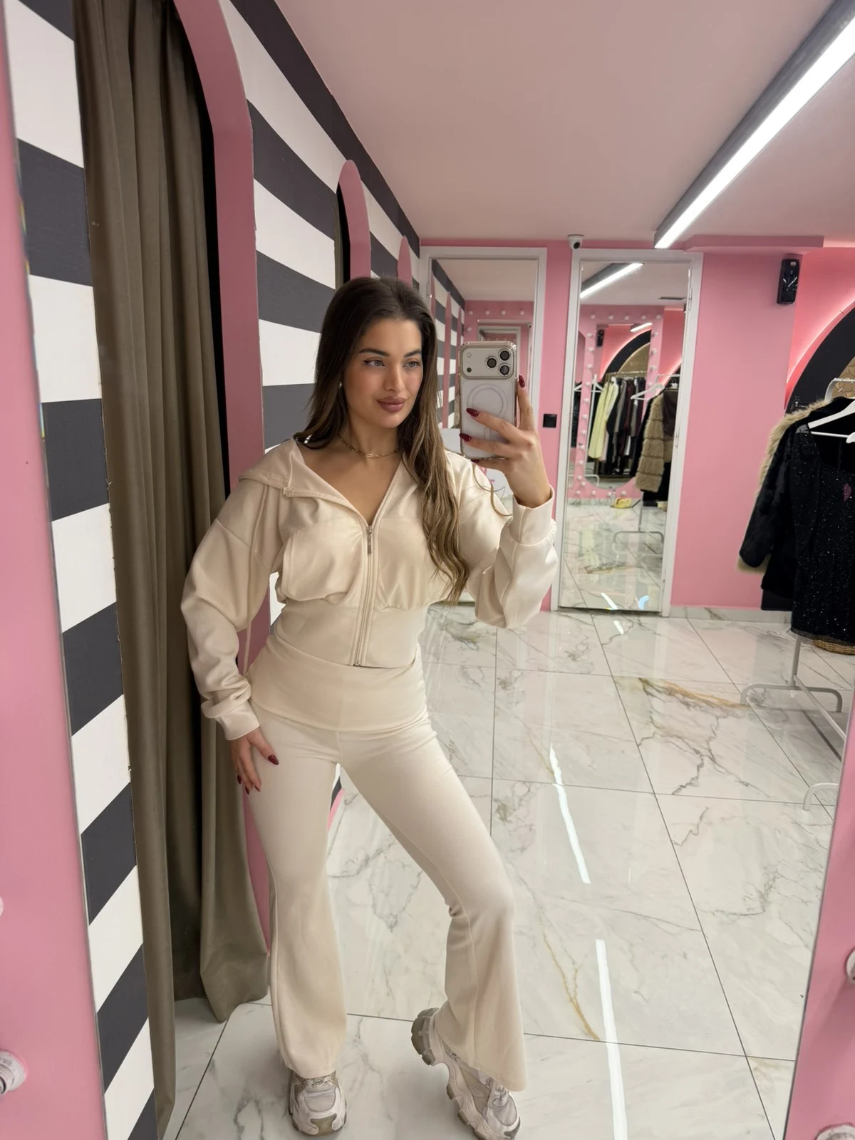 Άνετο και stylish σετ σε κρεμ απόχρωση που συνδυάζει άψογα το sporty με το chic. Περιλαμβάνει ζακέτα με φερμουάρ και παντελόνι καμπάνα που αγκαλιάζει όμορφα το σώμα. Ιδανικό για καθημερινά looks με άνεση και στυλ.