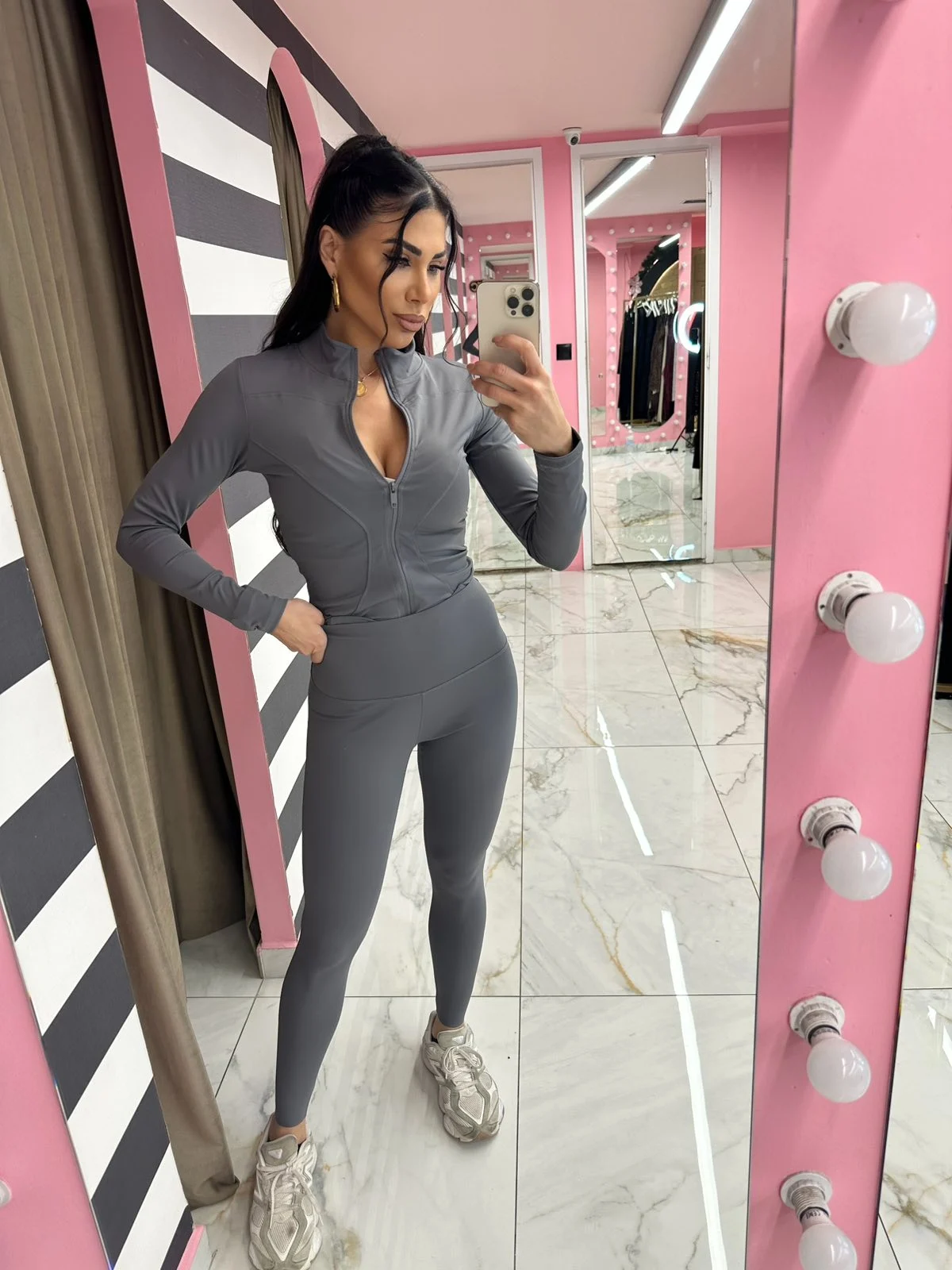 Αθλητικό σετ σε γκρι απόχρωση με εφαρμοστή γραμμή που αγκαλιάζει το σώμα. Το jacket με φερμουάρ αναδεικνύει το πάνω μέρος, ενώ το ψηλόμεσο κολάν προσφέρει άνεση και στήριξη. Ιδανικό για γυμναστήριο αλλά και sporty street looks.