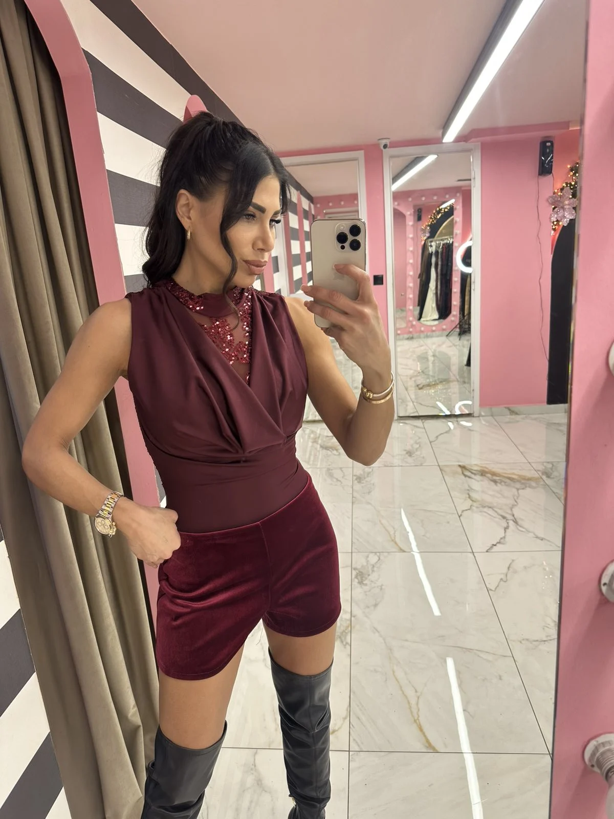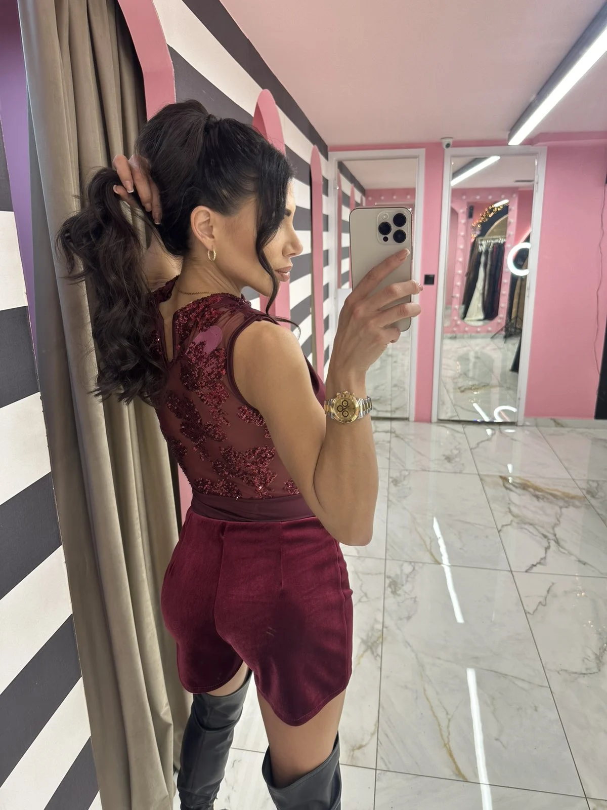 Απόλυτα θηλυκό κορμάκι με glamorous χαρακτήρα. Το μπορντό χρώμα και η δαντέλα χαρίζουν luxury αποτέλεσμα.