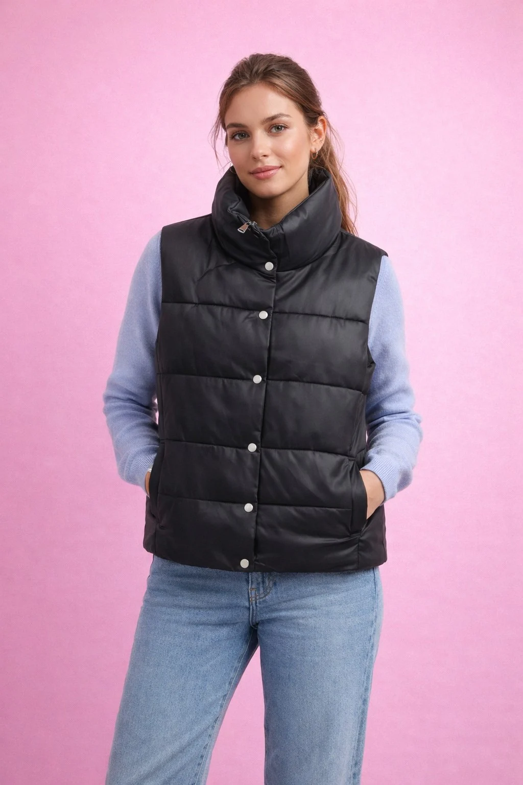 Αμάνικο puffer jacket σε μαύρο χρώμα με ψηλό γιακά και κουμπιά σούστες μπροστά, για ζεστασιά και στυλ όλη μέρα. Ελαφρύ αλλά ζεστό, ιδανικό για layering πάνω από φούτερ, πλεκτά ή φούτερ φορέματα. Δίνει sporty αλλά και chic ύφος, τέλειο για καθημερινές εμφανίσεις από το πρωί μέχρι το βράδυ.