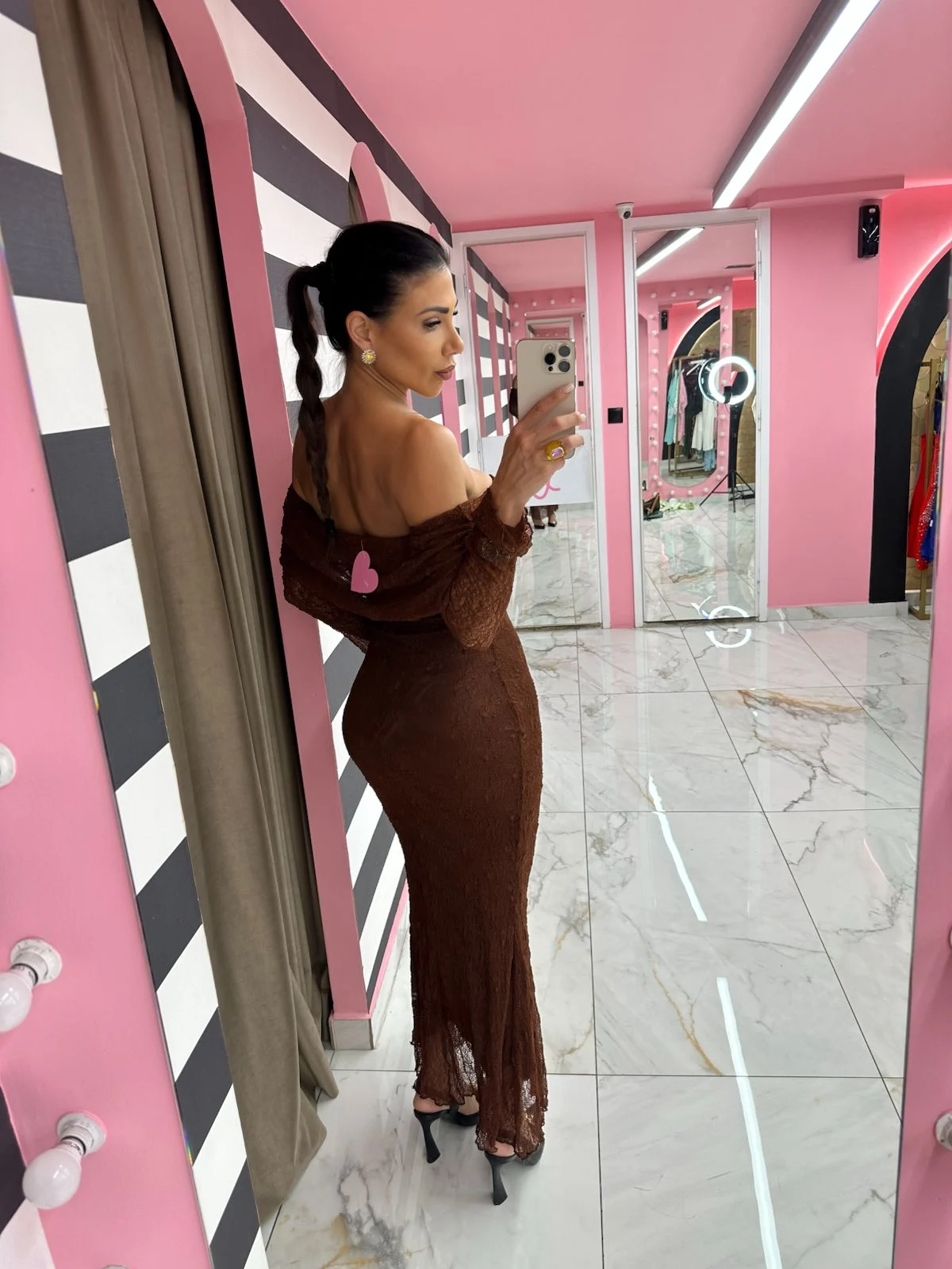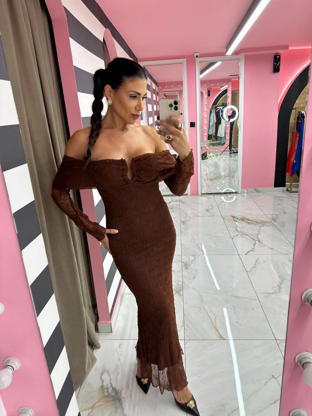 Σοφιστικέ καφέ μάξι φόρεμα, με μακριά μανίκια και ντεκολτέ off-shoulder που αναδεικνύει τη θηλυκότητα. Συνδυάζει διαχρονικό στυλ με άνετη εφαρμογή.