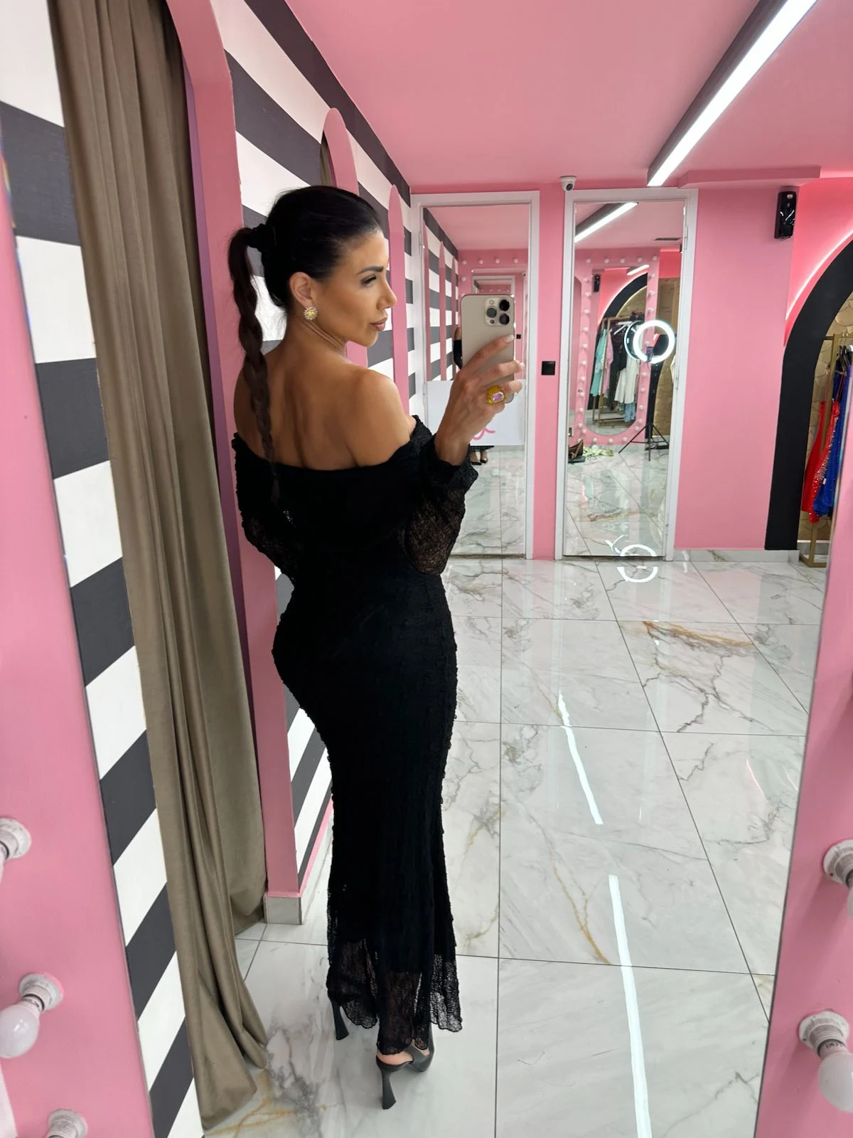 Εντυπωσιακό μαύρο μάξι φόρεμα από φίνα δαντέλα, με ώμους εκτός και εφαρμοστή γραμμή που αγκαλιάζει το σώμα. Ιδανικό για βραδινές εμφανίσεις με κομψότητα και δυναμισμό.