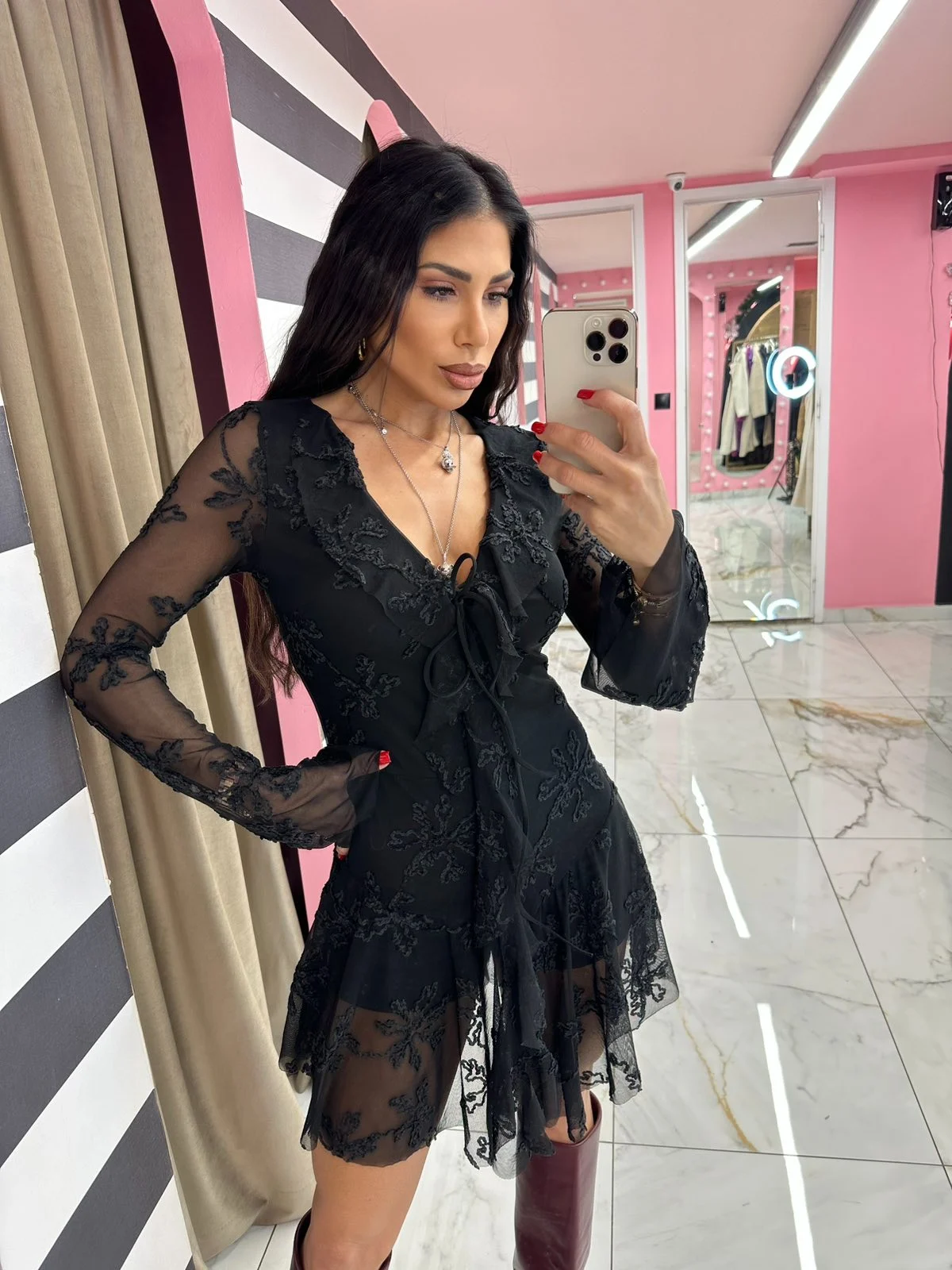 Κλασικό μαύρο mini φόρεμα με ανάγλυφη δαντέλα και διαφάνειες που αναδεικνύουν τη σιλουέτα. Το βαθύ V ντεκολτέ και τα ελαφρώς καμπάνα μανίκια δίνουν κομψό αλλά τολμηρό αποτέλεσμα.