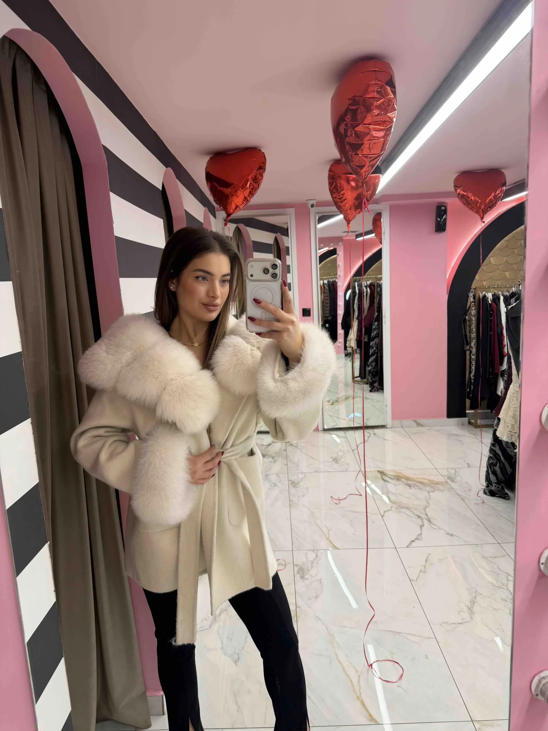 Εντυπωσιακό faux fur σε γιακά και μανίκια που δίνει rich & elegant ύφος, ενώ η ζώνη στη μέση αγκαλιάζει τέλεια τη σιλουέτα 🤍