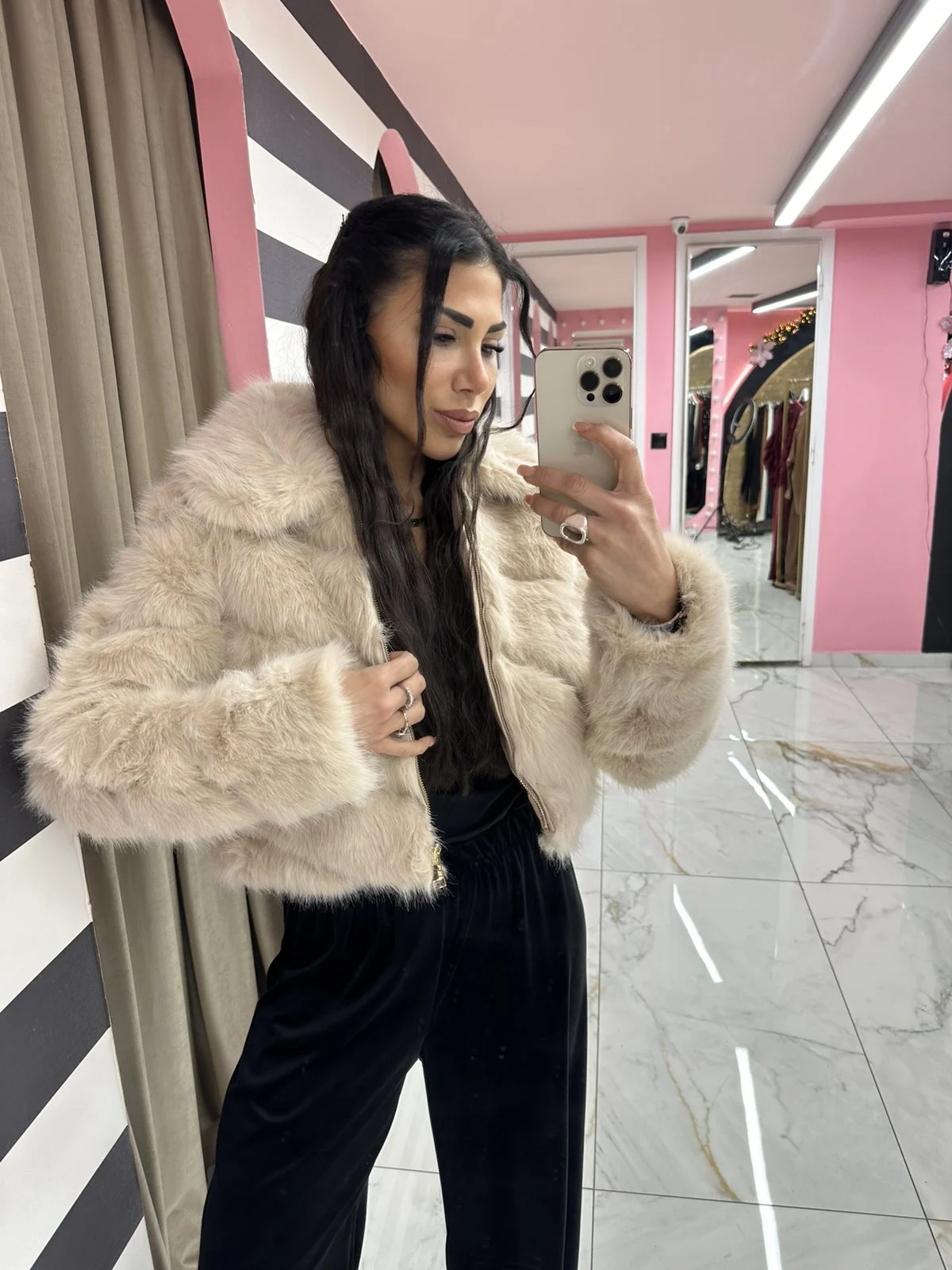 Κοντή οικολογική γούνα σε μπεζ απόχρωση με απαλή υφή και κομψή γραμμή. Φοριέται εύκολα από το πρωί έως το βράδυ και δίνει elegant αποτέλεσμα σε κάθε outfit.
