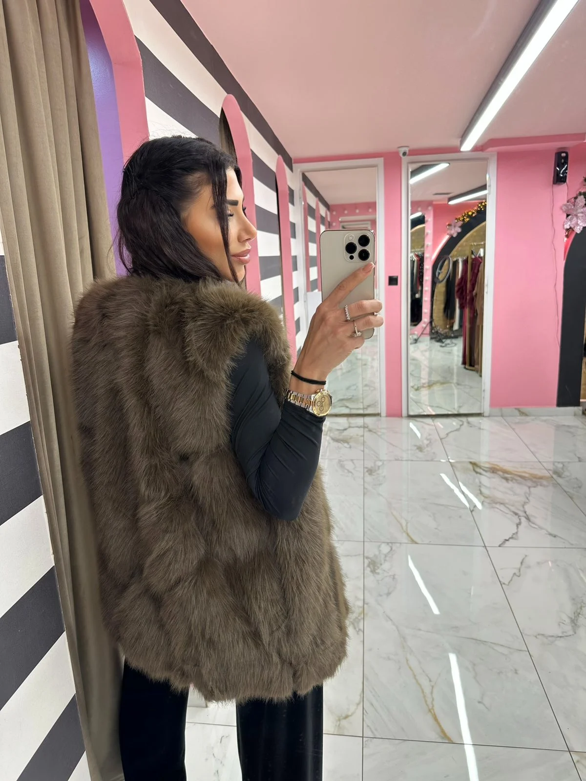 Διαχρονική οικολογική γούνα σε καφέ απόχρωση που συνδυάζεται εύκολα με κάθε outfit, προσφέροντας κομψό αποτέλεσμα.