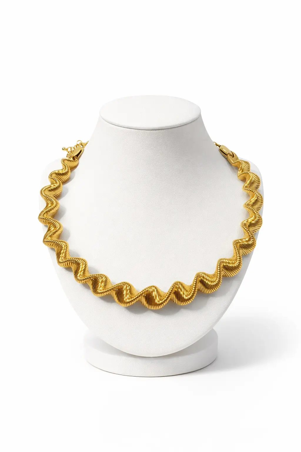 Εντυπωσιακό κολιέ από ανοξείδωτο ατσάλι σε χρυσή απόχρωση με μοναδικό κυματιστό σχέδιο που χαρίζει δυναμικό και μοντέρνο χαρακτήρα. Το ιδιαίτερο design του αγκαλιάζει όμορφα τον λαιμό και αποτελεί το ιδανικό statement κόσμημα για να απογειώσει κάθε εμφάνιση, από καθημερινά outfits μέχρι πιο βραδινά looks.