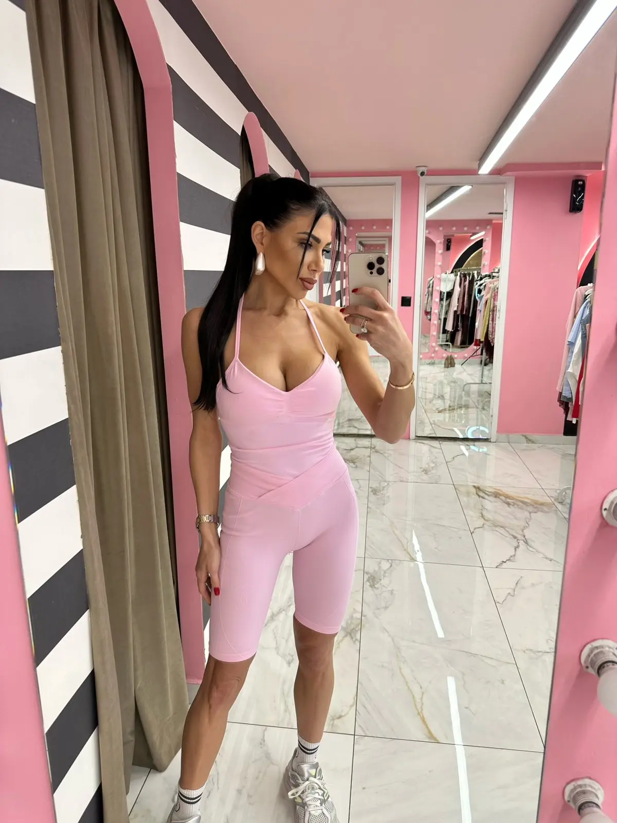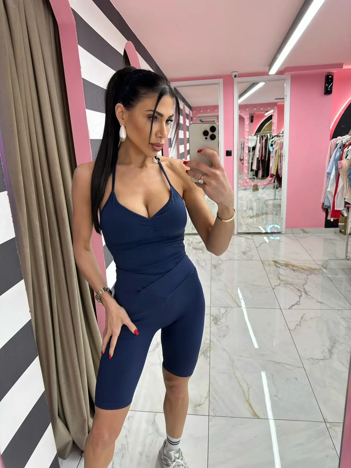 Top με λεπτές τιράντες και ελαφρύ ντραπέ στο μπούστο για θηλυκό αποτέλεσμα, συνδυασμένο με biker κολάν ψηλόμεσο που σμιλεύει και προσφέρει άνεση σε κάθε κίνηση.