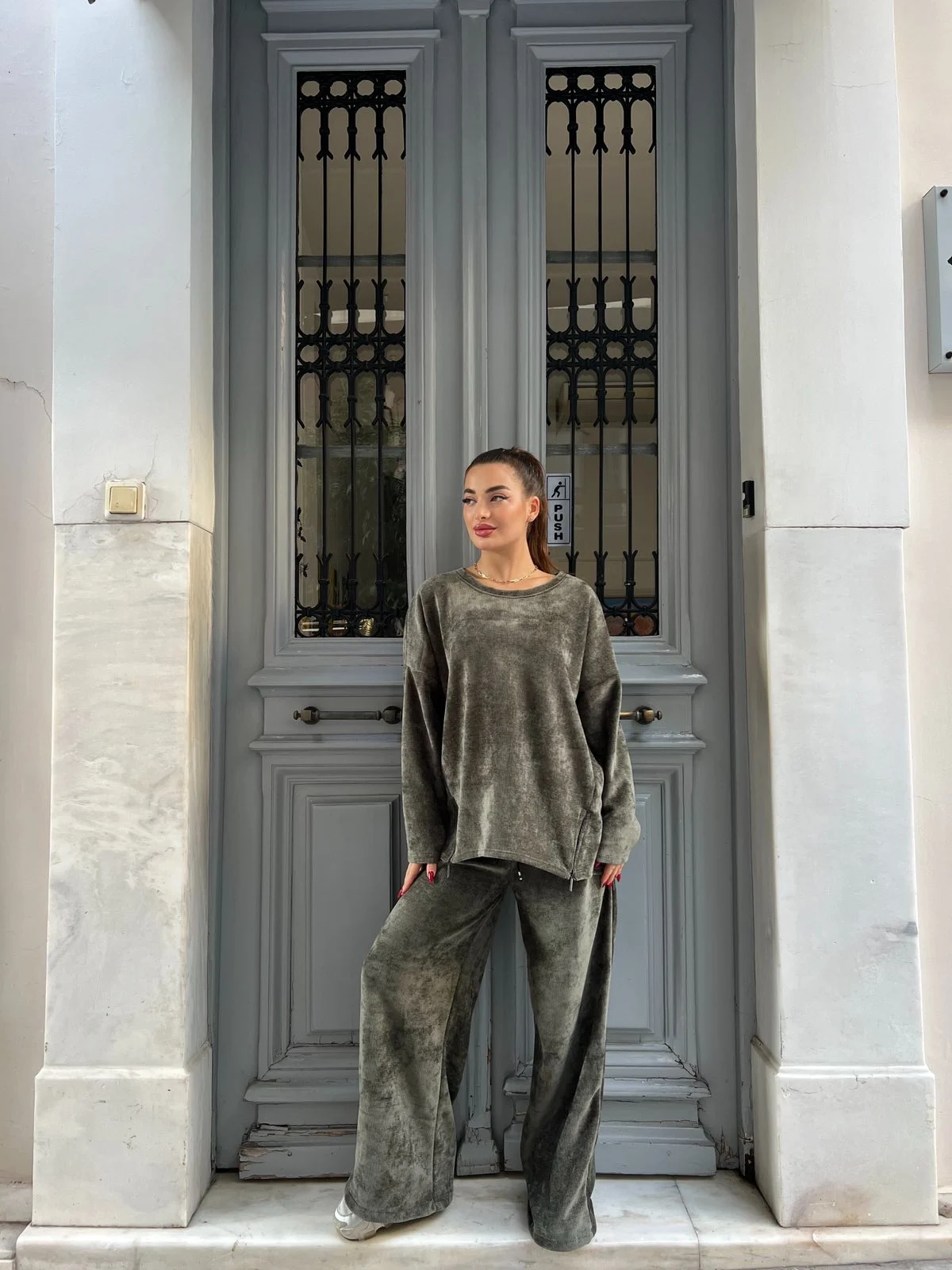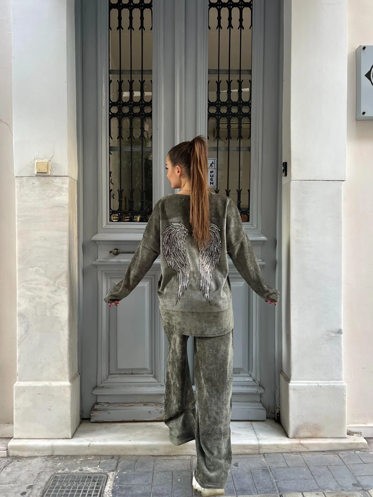 Khaki βελούδινο σετ με φτερά στην πλάτη — κομψό, μοντέρνο και ιδιαίτερο. Ιδανικό για cozy εμφανίσεις με fashionable touch.