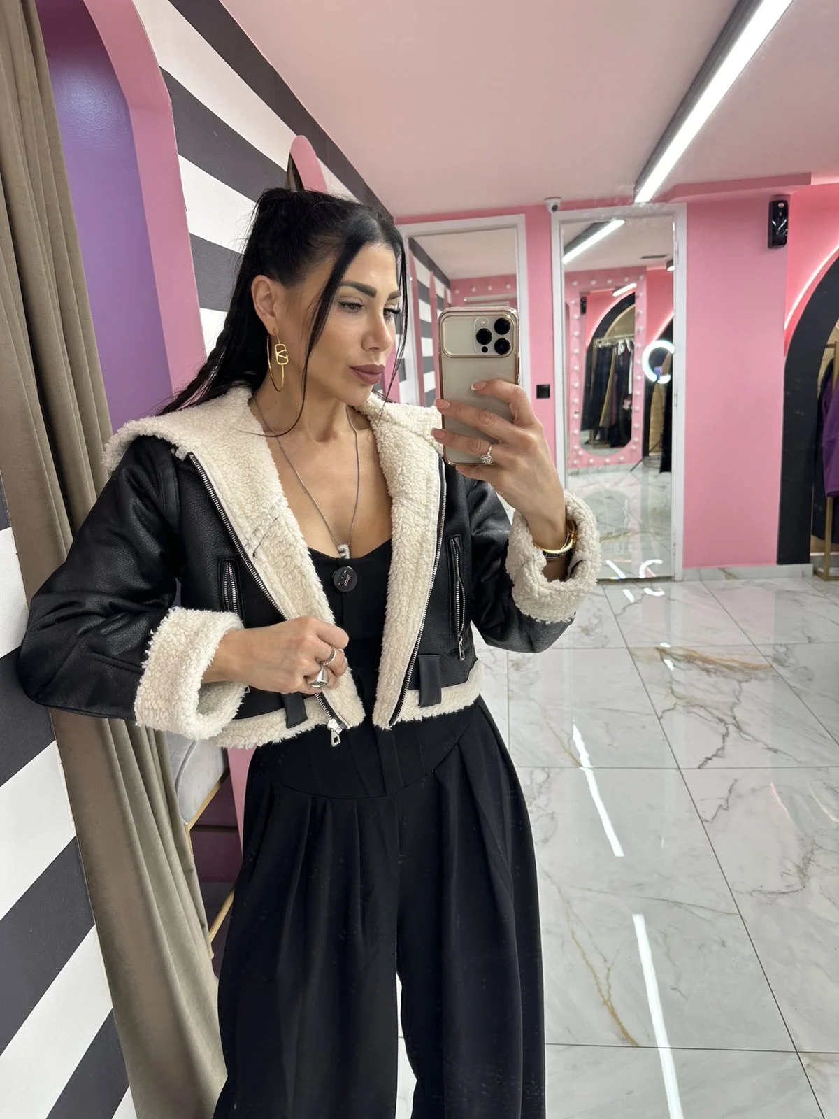 Μαύρο cropped jacket με plush λευκή γούνα στο γιακά και στα μανίκια. Δερματίνη υψηλής ποιότητας, ζεστό εσωτερικό, και molto chic χειμερινή εμφάνιση. Από τα κομμάτια που φοριούνται non-stop.