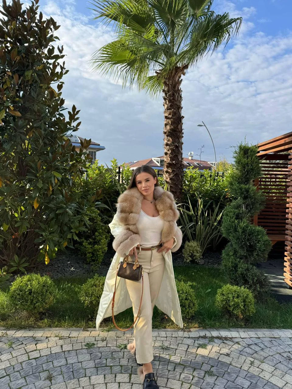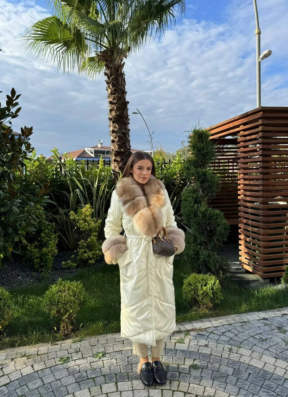 Μακρύ premium παρκά σε σατινέ ιβουάρ απόχρωση, με εντυπωσιακή αληθινή γούνα στον γιακά και στα μανίκια. Προσφέρει απόλυτη ζεστασιά χωρίς βάρος, ενώ η ζώνη στη μέση διαμορφώνει τέλεια σιλουέτα. Έχει κομψή λάμψη, high-end λεπτομέρειες και διαχρονικό design που απογειώνει κάθε εμφάνιση από το πρωί μέχρι το βράδυ. Ιδανικό για χειμερινές εμφανίσεις με πολυτελή αισθητική. Σε περίπτωση που κάποιο νούμερο δεν είναι άμεσα διαθέσιμο, υπάρχει δυνατότητα κατασκευής κατόπιν παραγγελίας, προσαρμοσμένης στα μέτρα σας. Ο χρόνος παράδοσης είναι έως 10 εργάσιμες ημέρες.