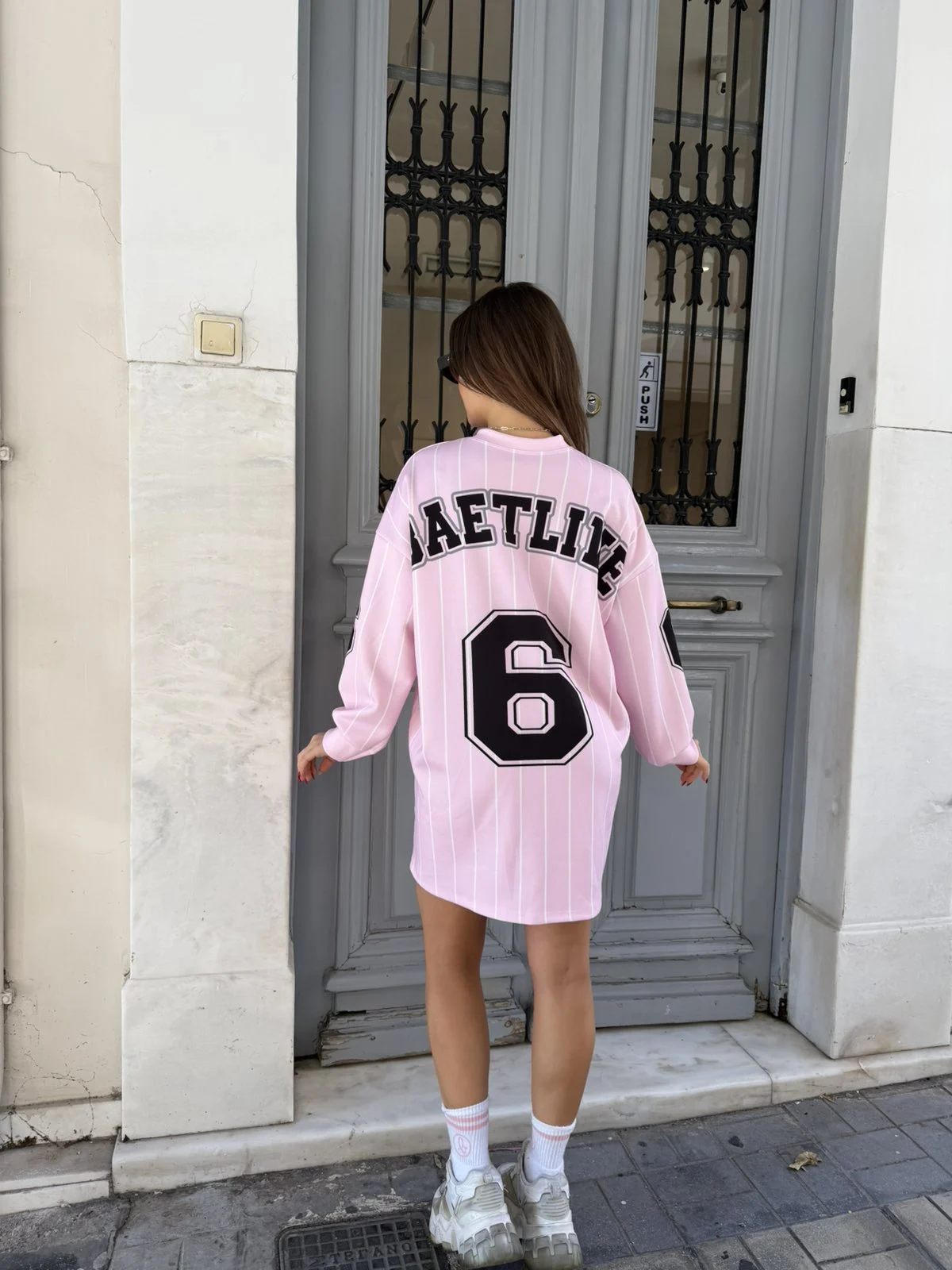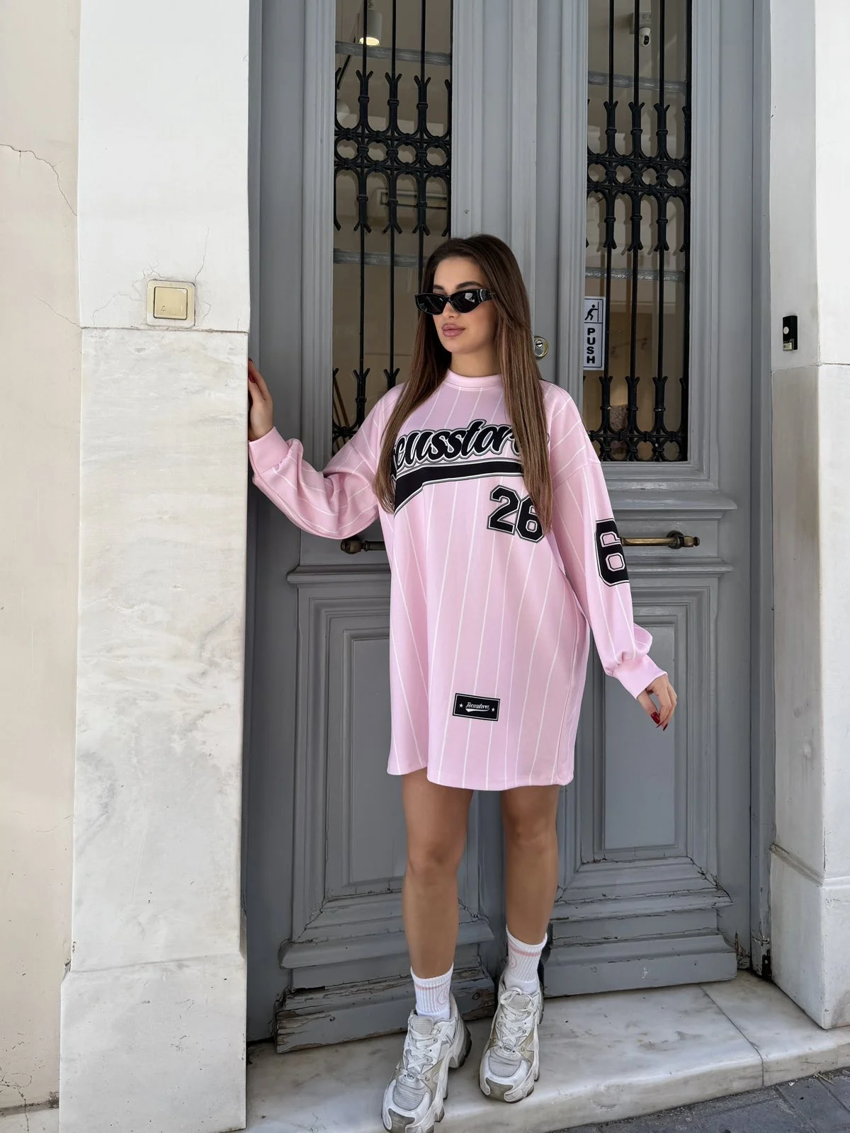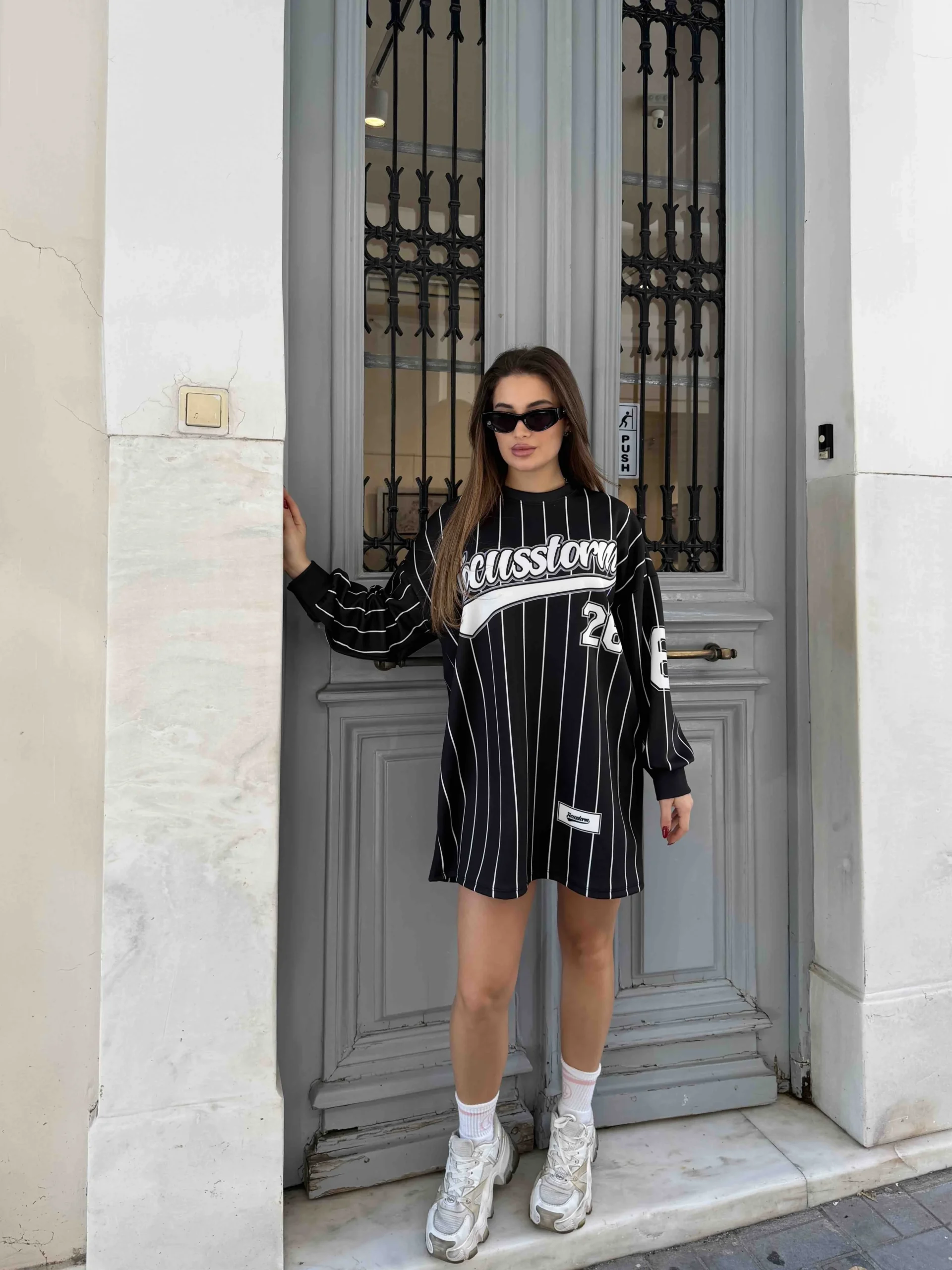 Mini dress σε oversized γραμμή με baseball-inspired design και κάθετες ρίγες που κολακεύουν το σώμα.