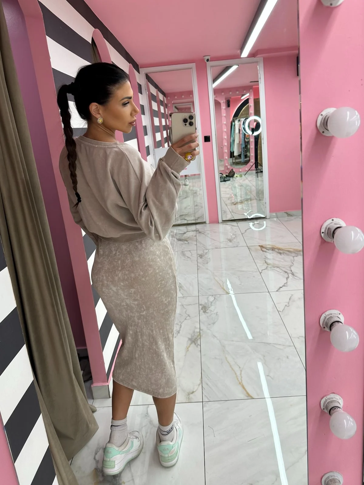 Minimal σετ δύο τεμαχίων (φούτερ + φόρεμα) σε μπεζ απόχρωση. Ευκολοφόρετο και κομψό, ιδανικό για καθημερινή χρήση.