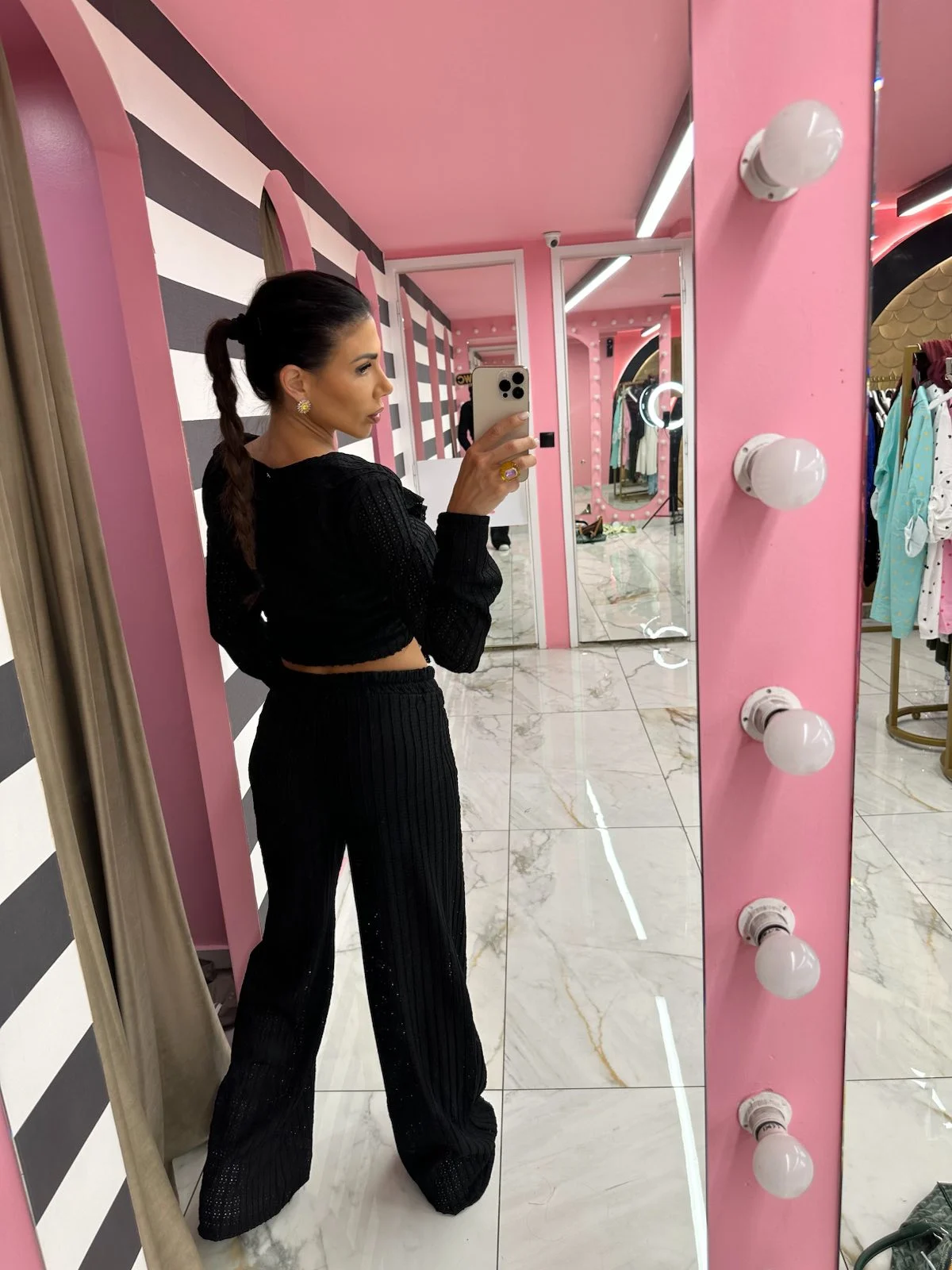 Κλασικό μαύρο σετ με ριγέ λεπτομέρειες, μακρυμάνικο τοπ με δέσιμο και παντελόνι σε ίσια γραμμή. Ιδανικό για chic εμφανίσεις με άνεση.