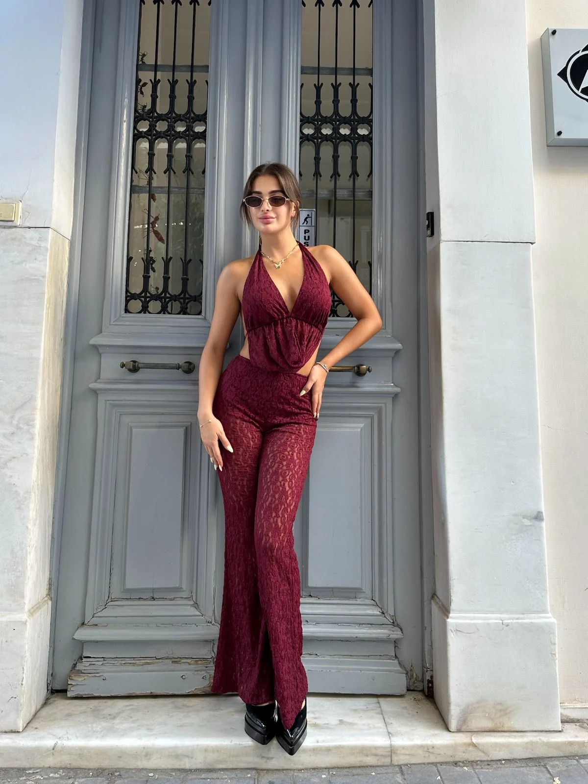 Sexy ολόσωμη φόρμα από δαντελωτό ύφασμα σε εντυπωσιακή μπορντό απόχρωση. Με βαθύ ντεκολτέ και εφαρμοστή γραμμή που αναδεικνύει τη σιλουέτα. Ιδανική για βραδινές εμφανίσεις που ξεχωρίζουν.