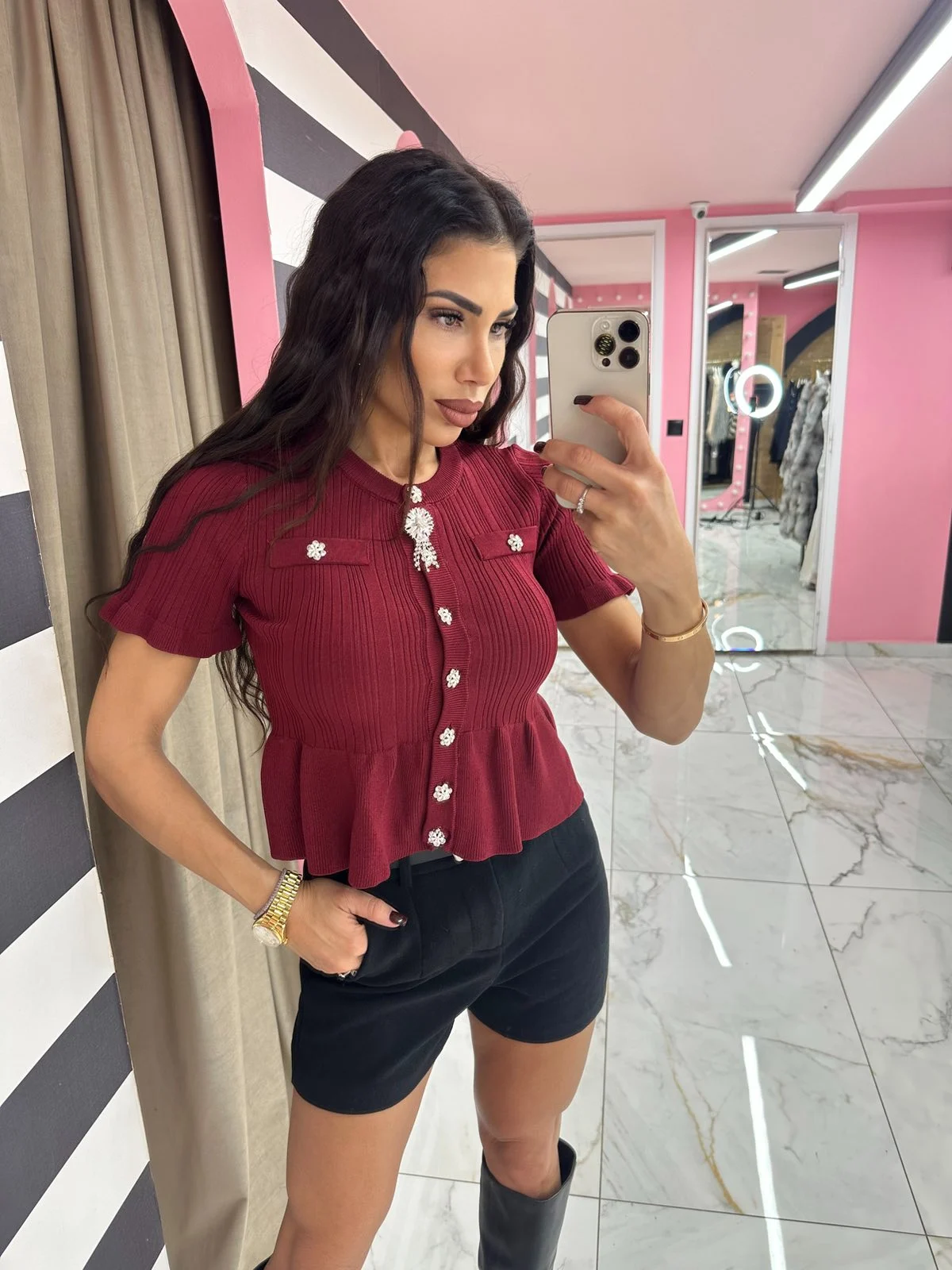 Εντυπωσιακό ριμπ top σε απόχρωση μπορντό με λαμπερά κουμπιά-κόσμημα και βολάν στη μέση που χαρίζουν θηλυκότητα και κομψότητα.
