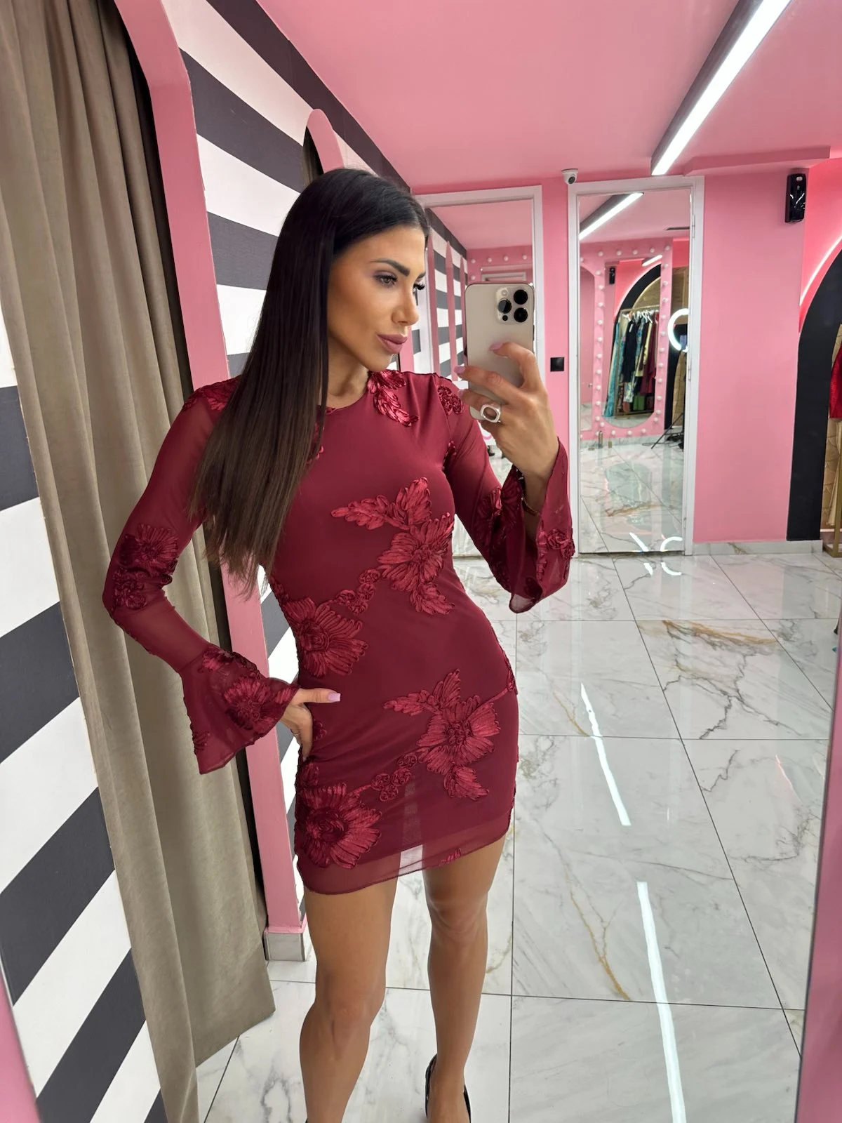 Μπορντό μίνι φόρεμα με κεντημένα λουλούδια στον ίδιο τόνο. Πολυτελής επιλογή για βραδινές εμφανίσεις, αναδεικνύει τη θηλυκότητα με έντονο χρώμα και elegant λεπτομέρειες.