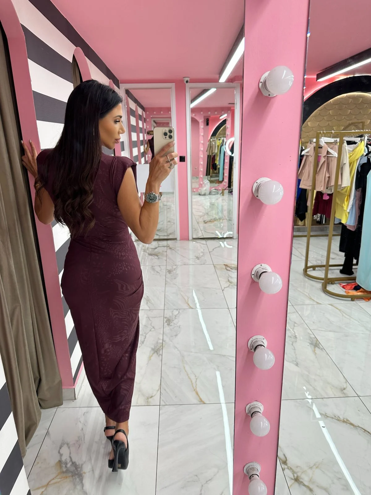 Μίντι φόρεμα σε βαθύ μπορντό χρώμα, με draped δέσιμο στη μέση και άνοιγμα στο μπροστινό μέρος που προσδίδει κομψότητα και δυναμισμό.