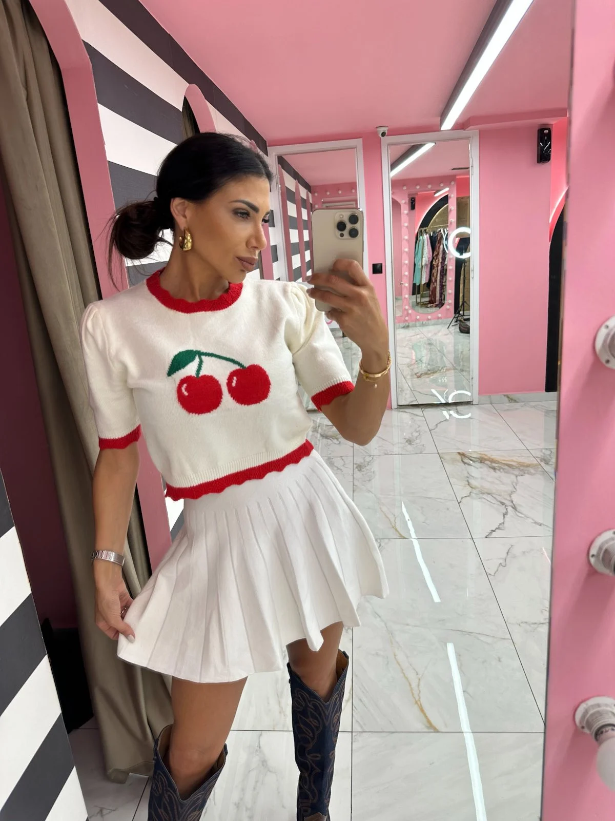 Λευκό πλεκτό τοπ με κοντό μανίκι και κόκκινες λεπτομέρειες στη λαιμόκοψη και στο τελείωμα. Το μοτίβο με τα κεράσια στο μπροστινό μέρος χαρίζει girly και παιχνιδιάρικη διάθεση, ιδανικό για casual εμφανίσεις με στυλ.