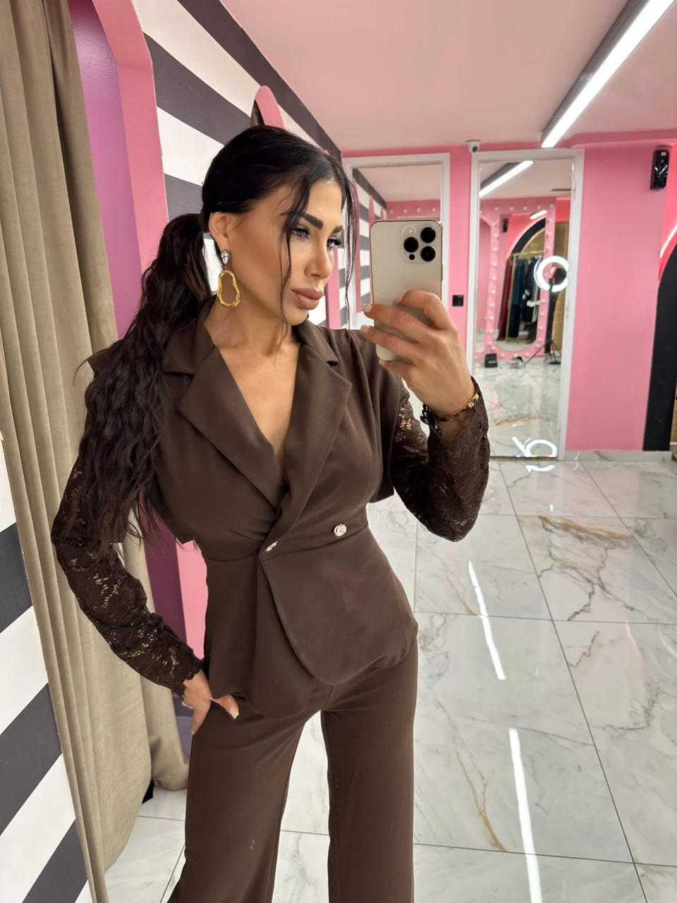 Ένα σικάτο σετ σε σοκολατί απόχρωση που αναδεικνύει τη θηλυκότητα με διακριτικό τρόπο. Το δαντελένιο μανίκι δίνει ρομαντική πινελιά, ενώ το σακάκι με ζώνη σμιλεύει τη μέση. Ιδανικό για βραδινές εμφανίσεις με στυλ και αυτοπεποίθηση.