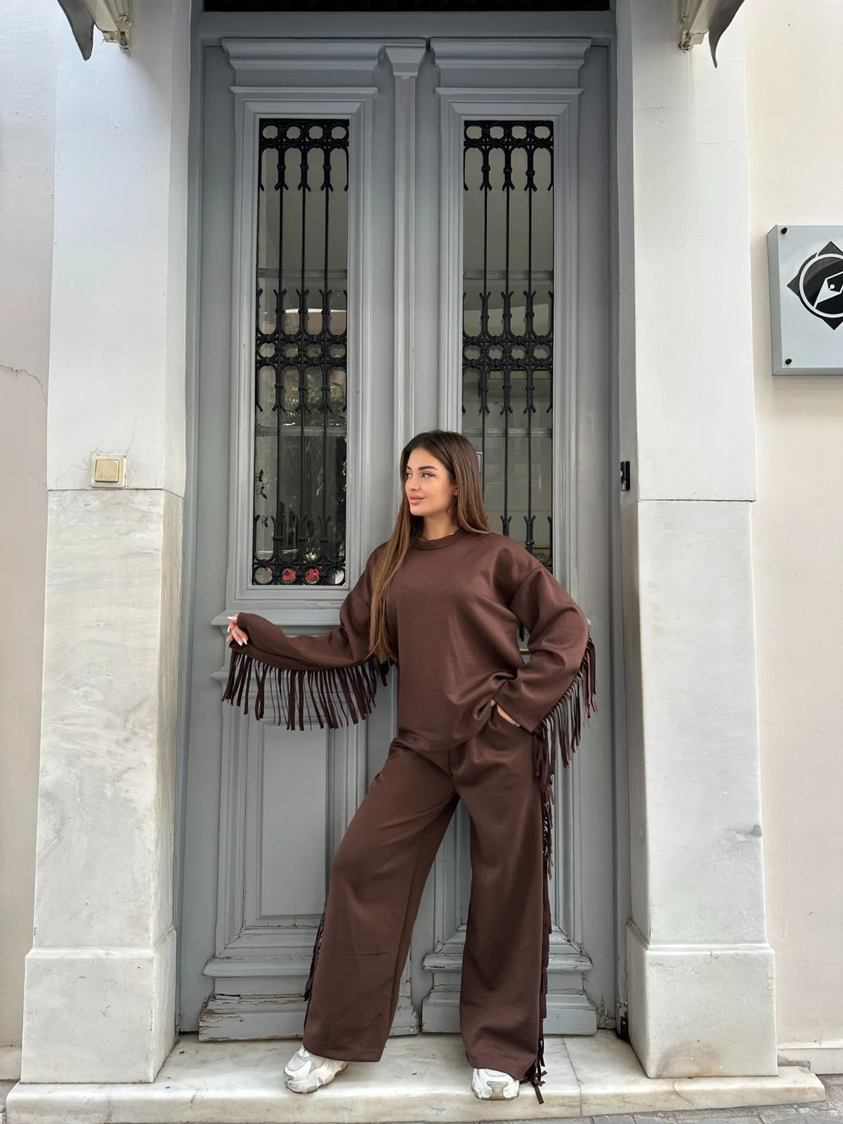 Καφέ σετ με κρόσια που δίνουν boho & chic vibe. Το ύφασμα είναι ελαστικό και μαλακό, ενώ η wide-leg γραμμή προσφέρει άνεση και κίνηση. Must-have για statement casual looks.