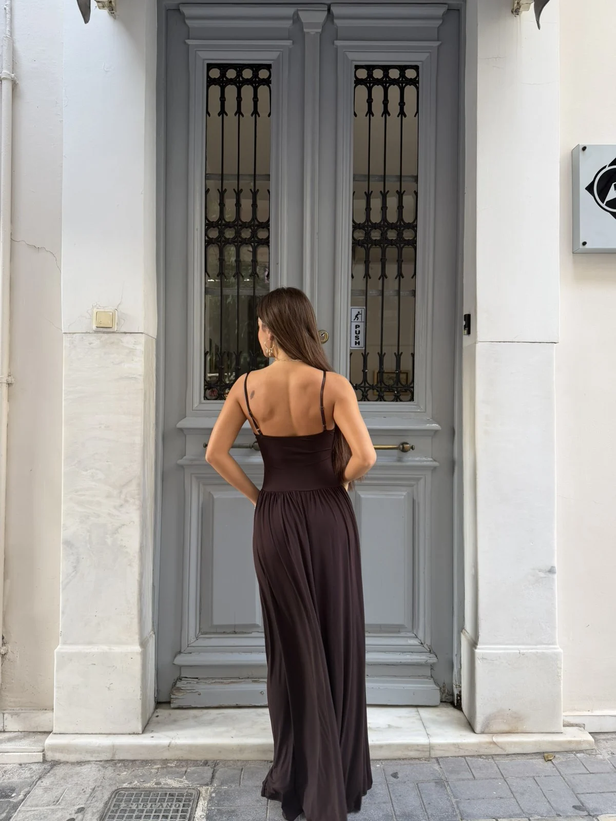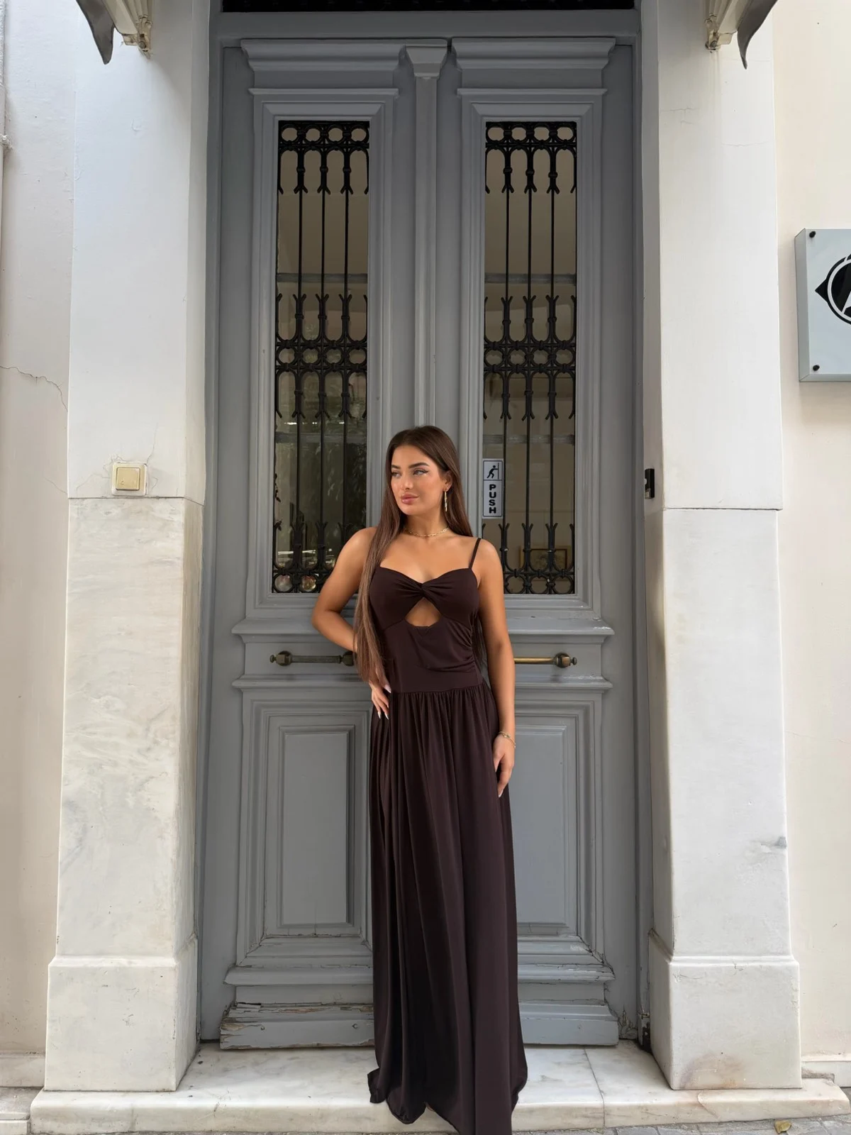 Ζεστή σοκολατί απόχρωση που δείχνει πολυτελής και σικάτη. Το twisted μπούστο και το διακριτικό cut–out αναδεικνύουν τέλεια το πάνω μέρος, ενώ η μαλακή maxi φούστα χαρίζει κίνηση και ροή.