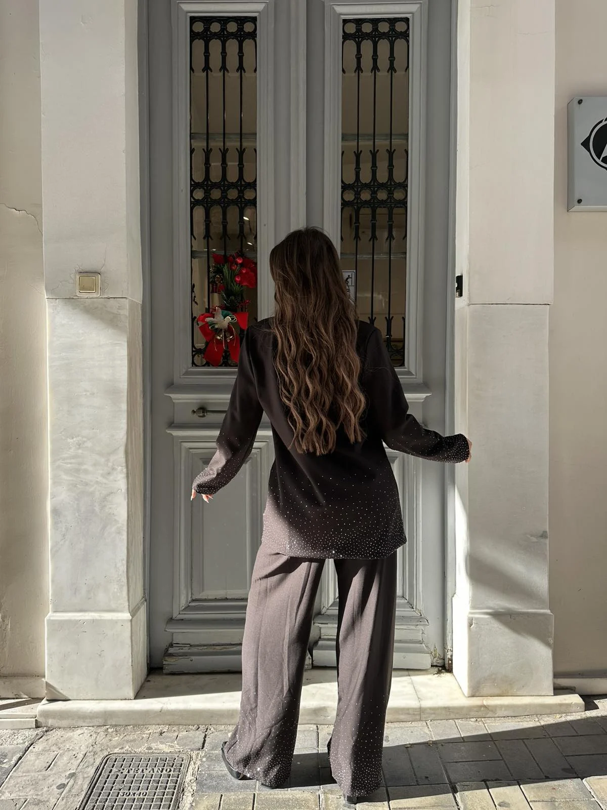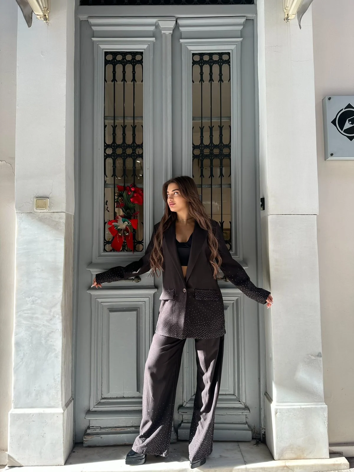 Total black κοστούμι με πλούσια στρας στο σακάκι και στο παντελόνι, για απόλυτο glam αποτέλεσμα. Άνετη εφαρμογή, τέλεια ποιότητα και look που γράφει πραγματικά πάνω στο σώμα. Must-have για βραδινές εμφανίσεις και event styling.