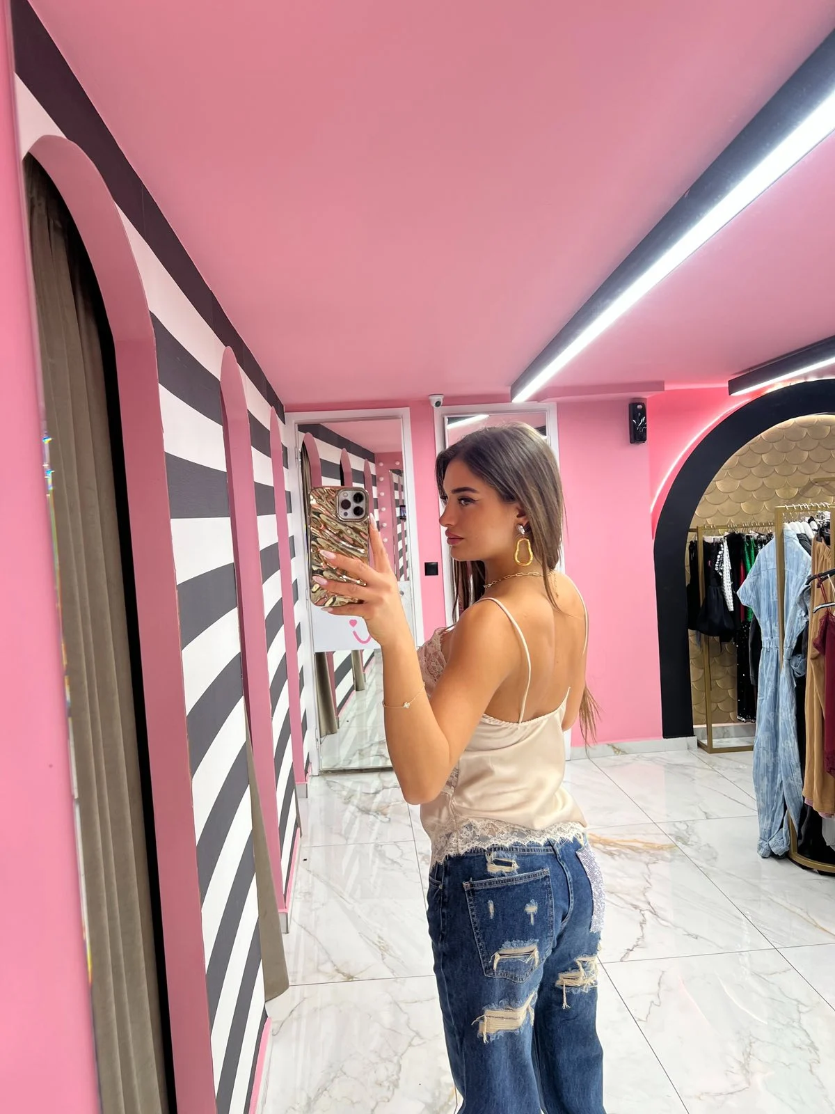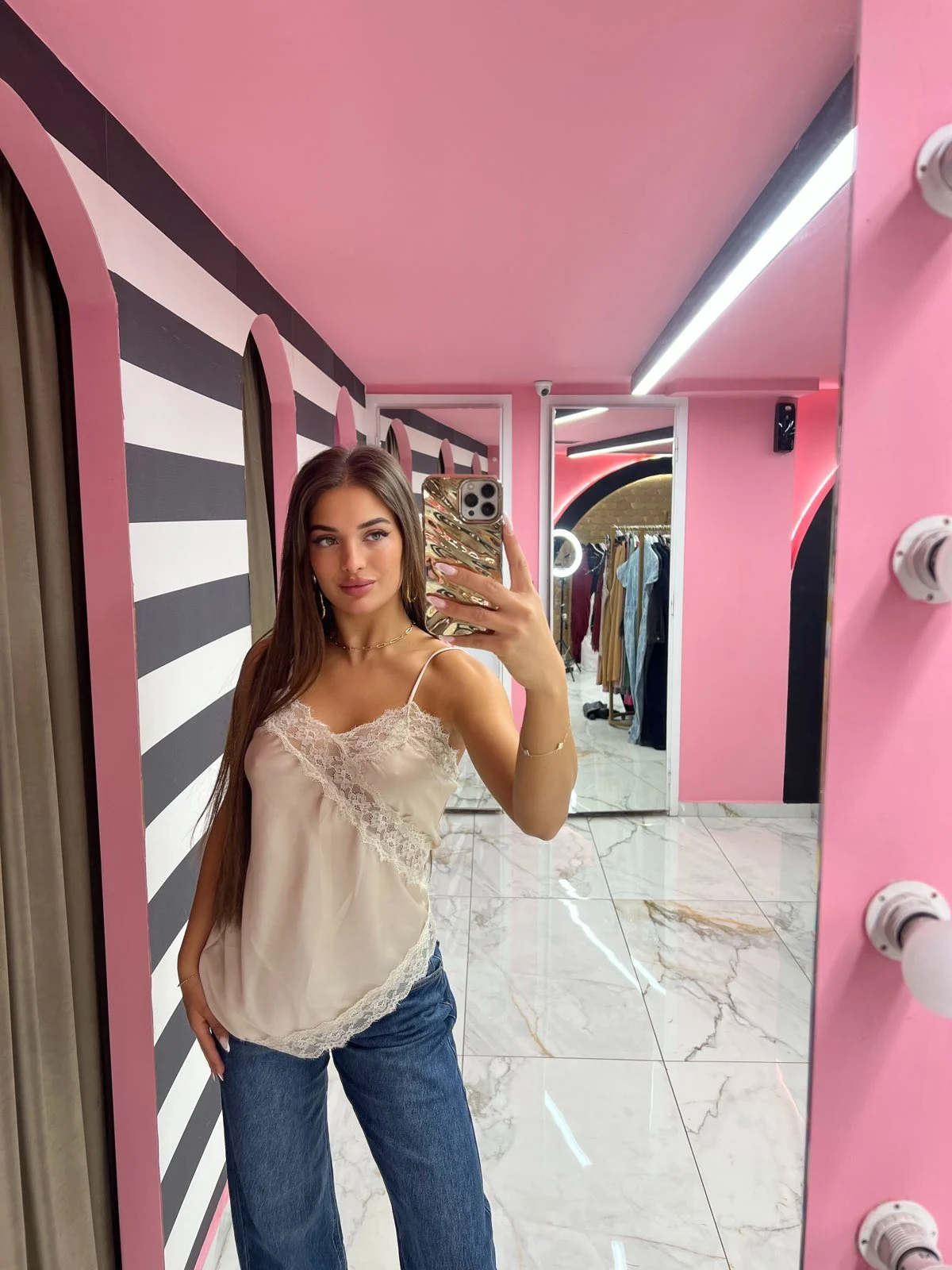 Minimal αλλά απόλυτα θηλυκό, σε απόχρωση απαλής κρέμας με δαντέλα στο τελείωμα. Φοριέται μέσα από σακάκια, με jeans ή φούστες για chic layering.