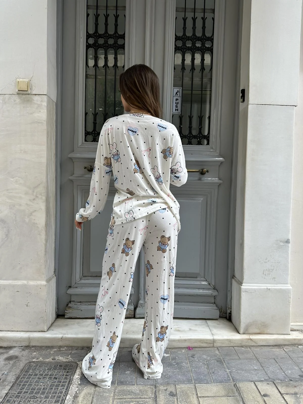 Λευκή βελούδινη πιτζάμα με παιχνιδιάρικα αρκουδάκια και καρδούλες — ιδανική για cozy βραδιές. Πολύ ελαστική, χουχουλιάρικη υφή που αγκαλιάζει το σώμα. Διαθέτει λάστιχο στη μέση για άνεση και κάλυψη έως 3XL.
