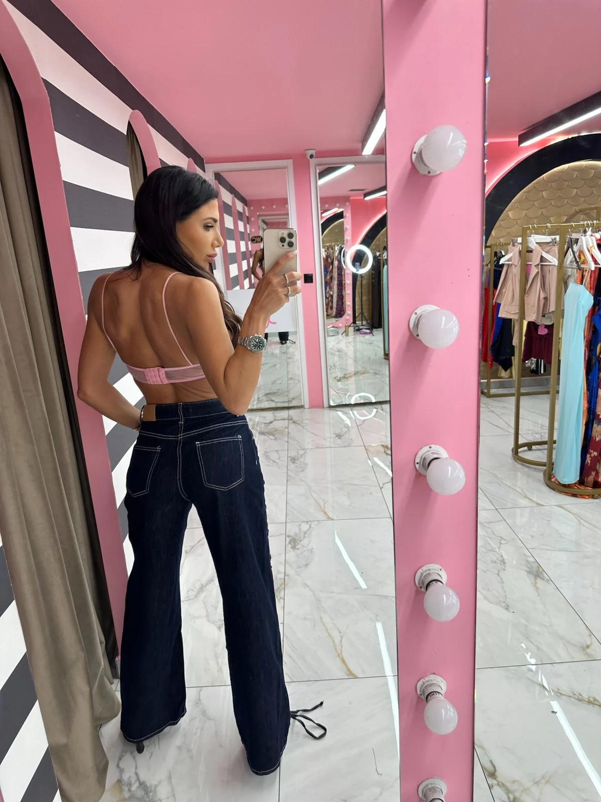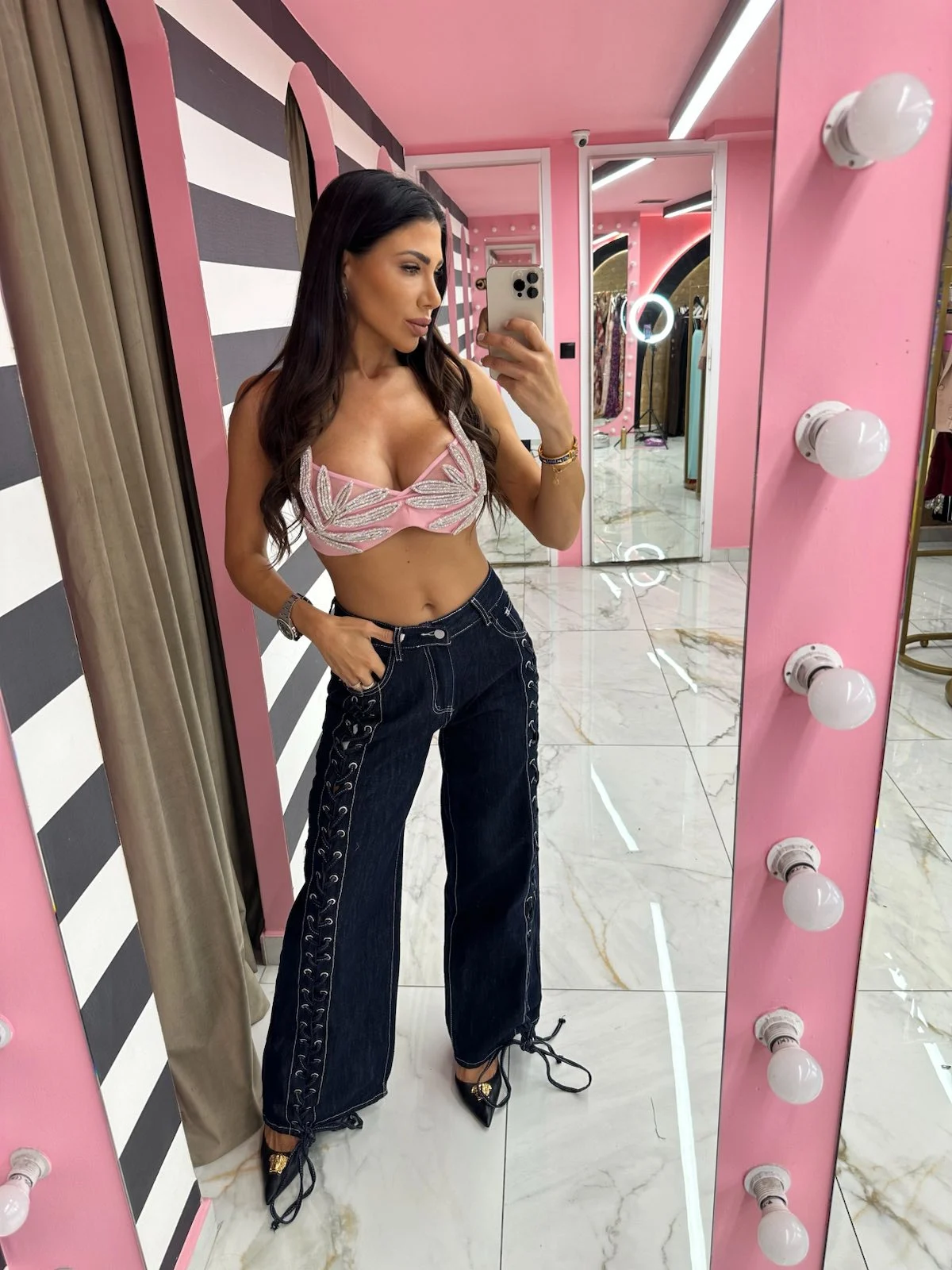 Denim παντελόνι σε μαύρη απόχρωση με κορδόνια στα πλαϊνά, που συνδυάζει το casual στυλ του τζιν με μια τολμηρή και fashion-forward πινελιά.