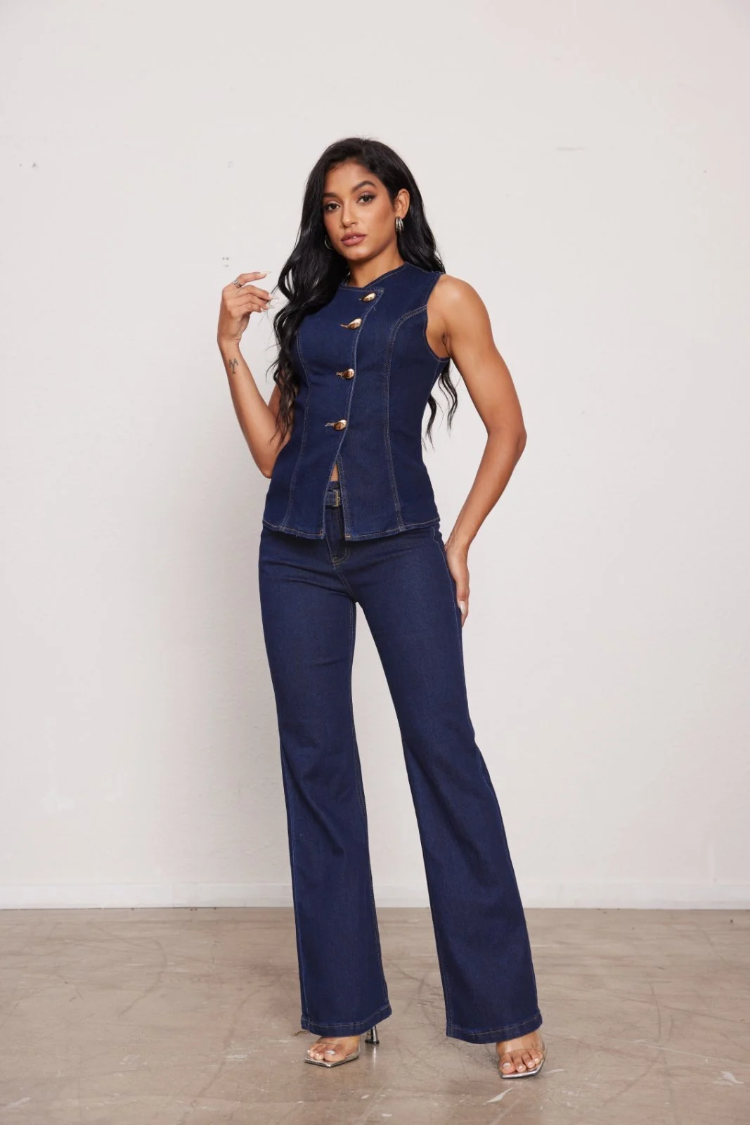 Το Denim Muse Set συνδυάζει τέλεια άνεση και στυλ. Το εφαρμοστό top με χρυσά κουμπιά αγκαλιάζει το σώμα, ενώ το παντελόνι σε ίσια γραμμή προσφέρει χαλαρή και άνετη εφαρμογή για all-day looks.