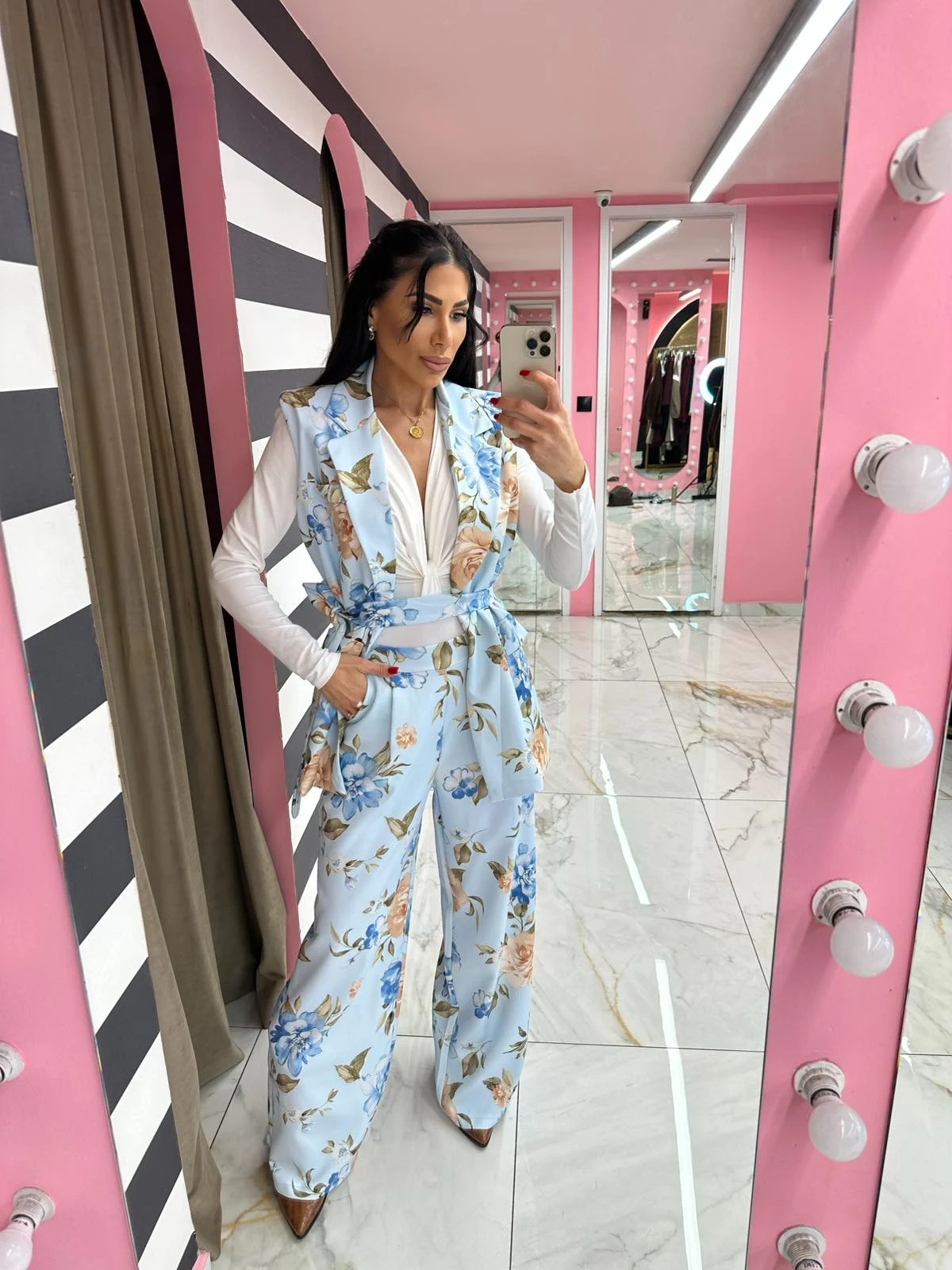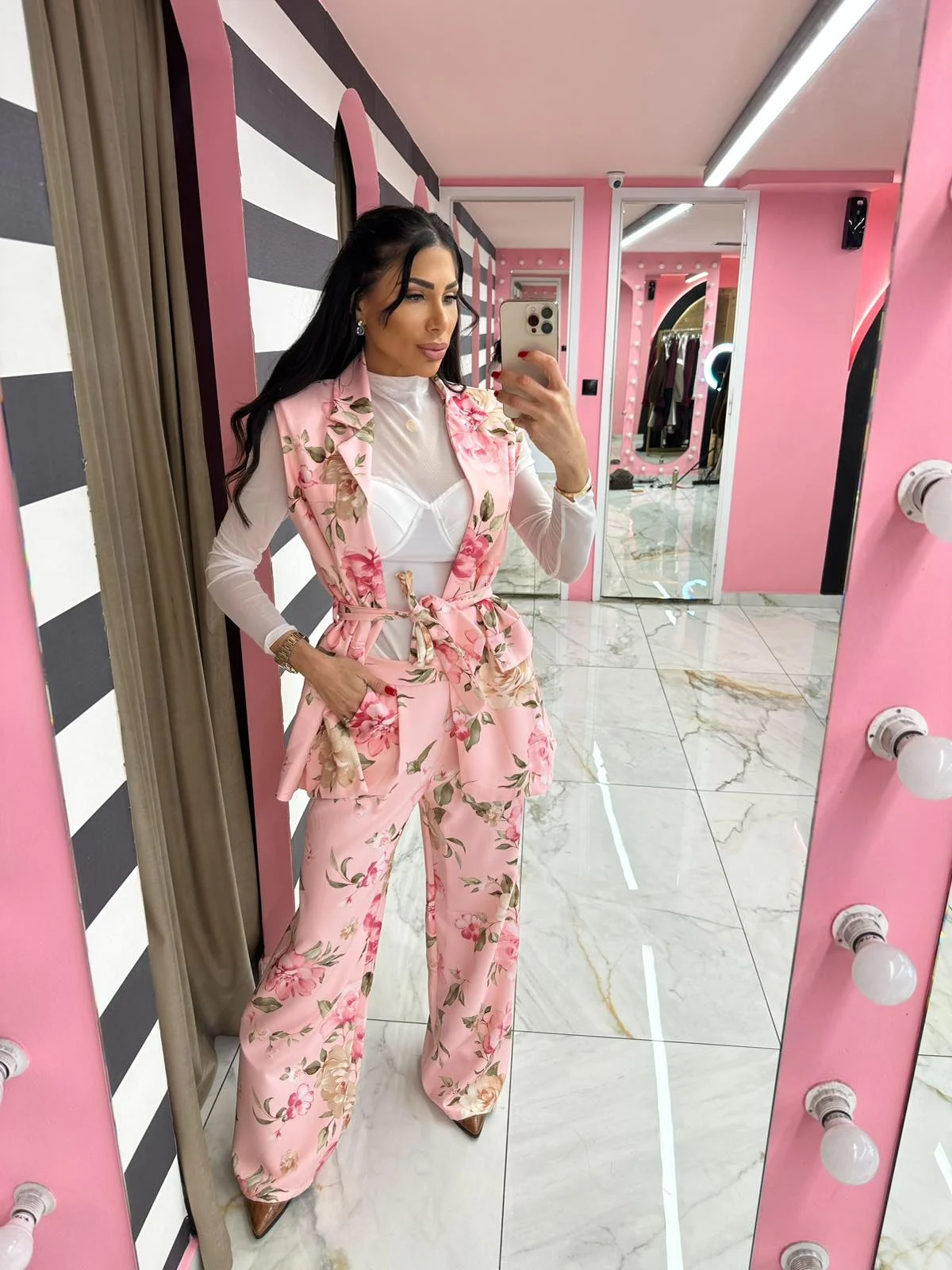 Εντυπωσιακό κοστούμι με floral σχέδιο που αποτελείται από γιλέκο με ζώνη και παντελόνι σε άνετη γραμμή. Το κομψό design και τα ρομαντικά λουλούδια δημιουργούν ένα ιδιαίτερο και θηλυκό look. Ιδανικό για chic εμφανίσεις από το πρωί μέχρι το βράδυ, συνδυάζεται τέλεια με κορμάκια ή tops για ένα elegant outfit.
