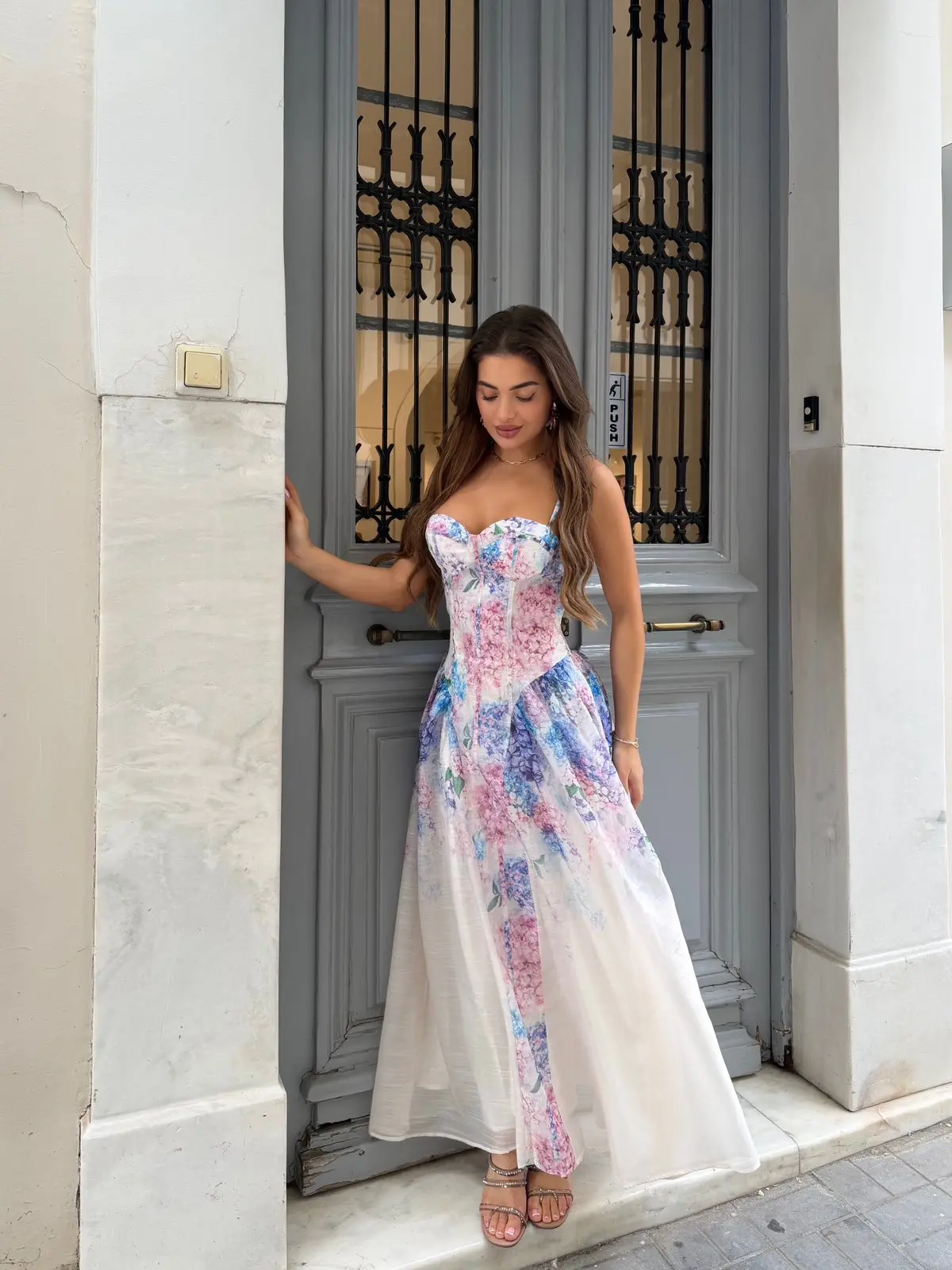 Εντυπωσιακό midi φόρεμα με ρομαντικό floral print σε αποχρώσεις ροζ, λιλά και γαλάζιου που θυμίζει ανθισμένες ορτανσίες. Το structured μπούστο με cups αγκαλιάζει τέλεια το σώμα και αναδεικνύει το ντεκολτέ, ενώ η αέρινη φούστα χαρίζει κομψότητα και κίνηση. Το σφηκοφωλιασμένο πίσω μέρος προσφέρει άνετη εφαρμογή και προσαρμόζεται ιδανικά στη σιλουέτα. Ιδανικό για καλοκαιρινές εμφανίσεις, βαπτίσεις, events ή ρομαντικές εξόδους.