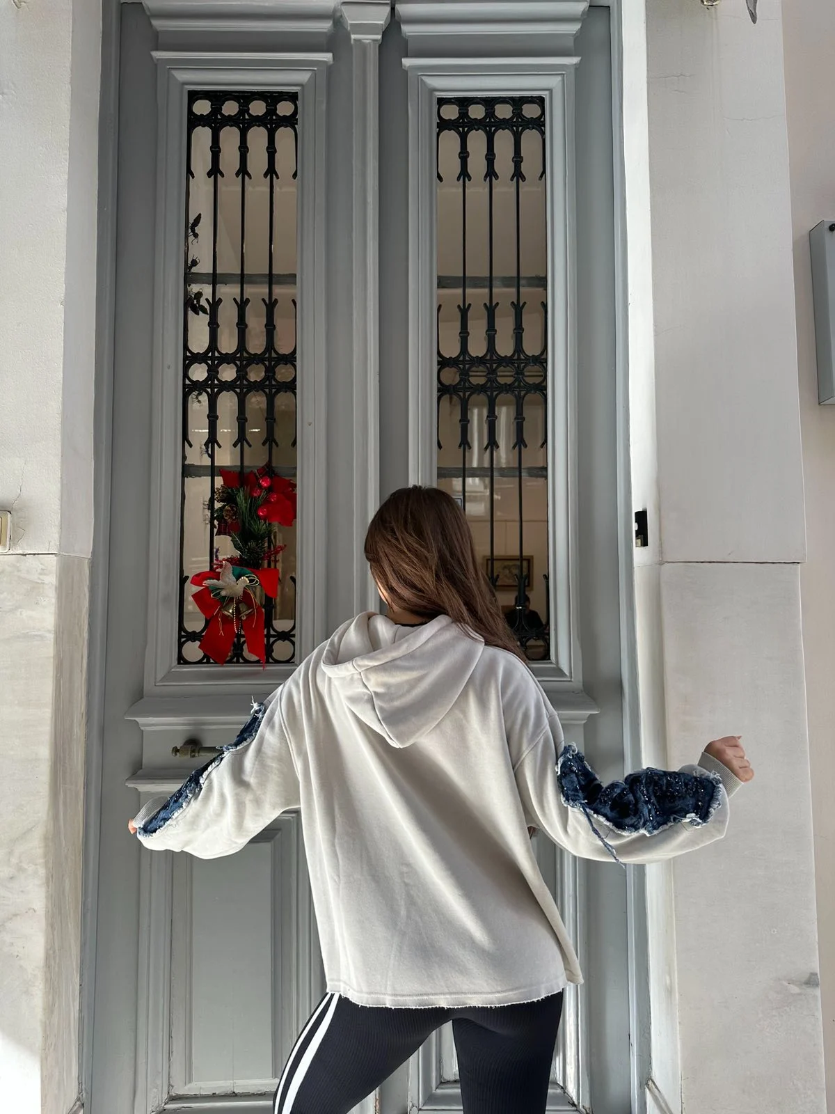 Εντυπωσιακό oversized hoodie σε εκρού απόχρωση με μεγάλο patch Kitty μπροστά, denim λεπτομέρειες και παγιέτες. Διαθέτει κουκούλα, μαλακό ύφασμα και street-style διάθεση. Πίσω μέρος με ιδιαίτερες επεξεργασίες και grunge ύφος. Άνετο, ζεστό και απόλυτο statement κομμάτι.