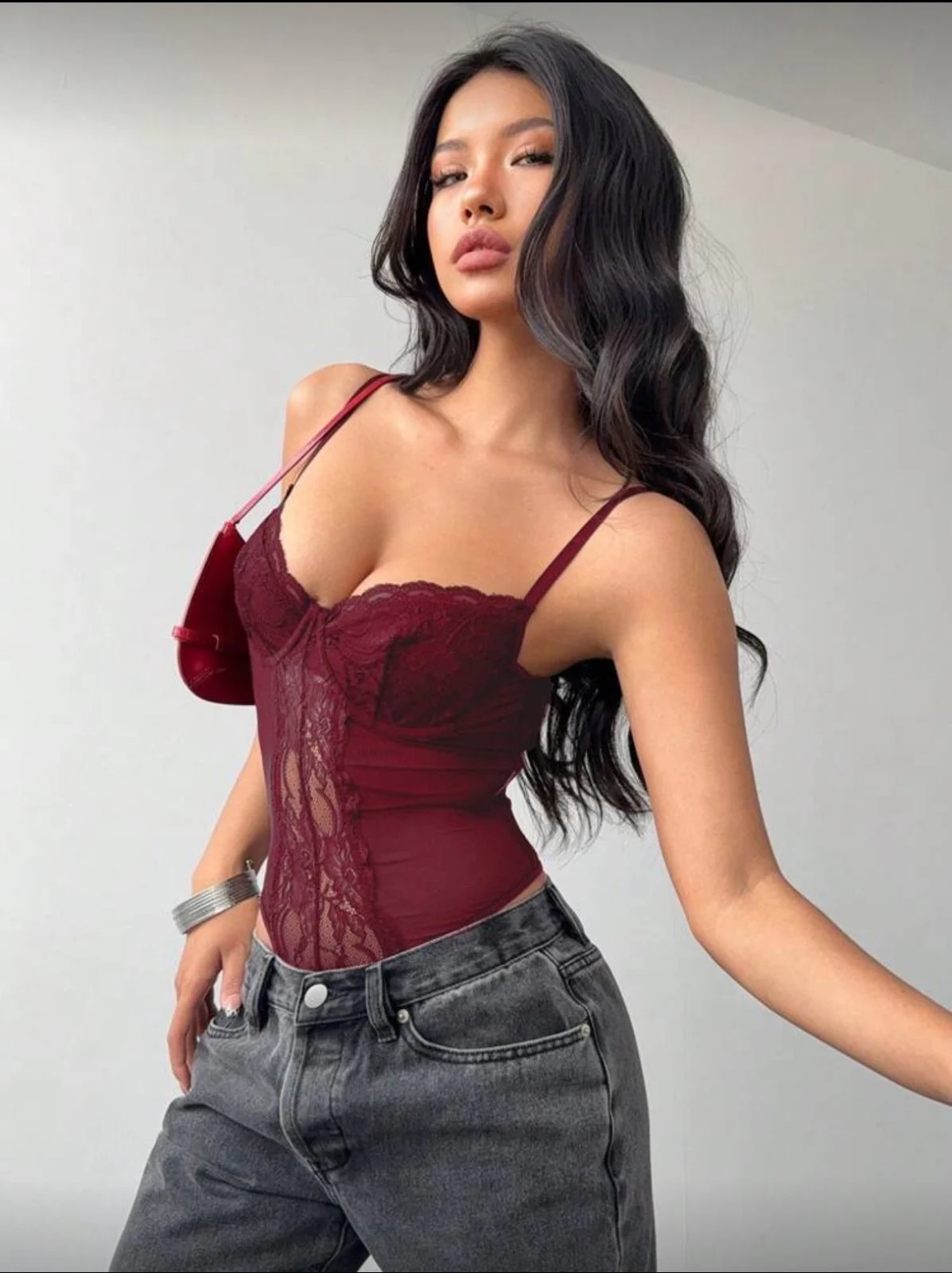 Ελαστικό μπορντό κορμάκι με δαντέλα μπροστά και ενίσχυση στο στήθος για σταθερή και sexy εφαρμογή. Διαφάνειες που αγκαλιάζουν τη μέση, λεπτές τιράντες και απόλυτα θηλυκή γραμμή. Το απόλυτο piece για βράδυ και statement looks.