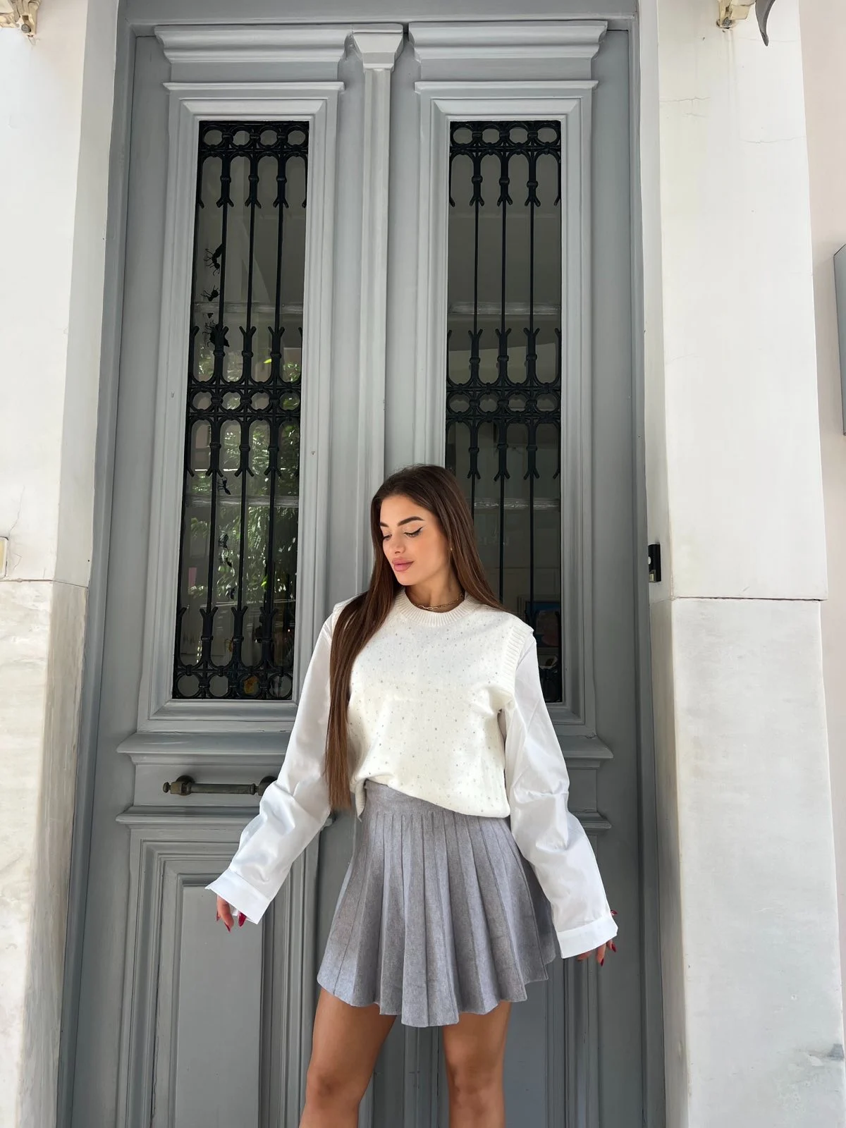 Λευκό top που δίνει την αίσθηση πουκαμίσου με διακριτικό knit γιλέκο στο πάνω μέρος. Στολισμένο με μικρές πέρλες για κομψότητα και χειμερινή φινέτσα. Άνετο, ευκολοφόρετο και τέλειο για elegant εμφανίσεις.