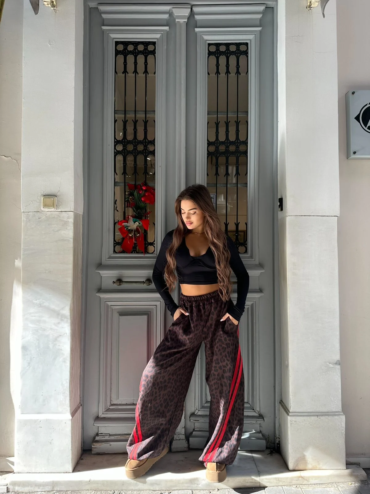 Leopard wide-leg παντελόνι με έντονη κόκκινη ρίγα στο πλάι. Ελαστική μέση, άνετη εφαρμογή και δυνατότητα ρύθμισης στο τελείωμα με κορδόνι. Stylish, καθημερινό και τόσο άνετο που θα το φοράς όλη μέρα.