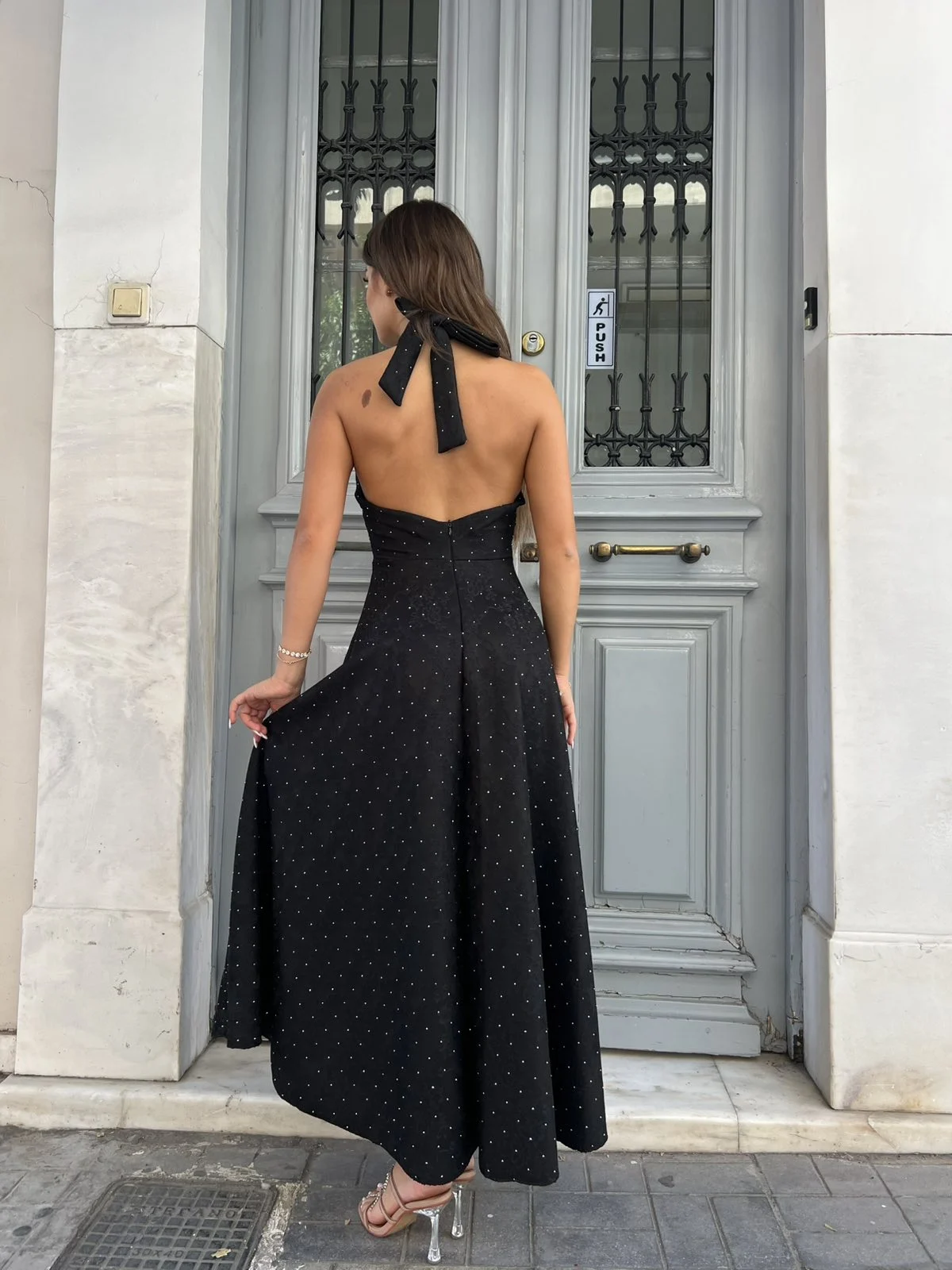 Κλασικό midi dress σε μαύρο χρώμα, διακοσμημένο με διακριτικές αστραφτερές λεπτομέρειες που του δίνουν glam χαρακτήρα. Κομψό, minimal και πάντα in style, είναι το φόρεμα που δεν πρέπει να λείπει από καμία γκαρνταρόμπα.