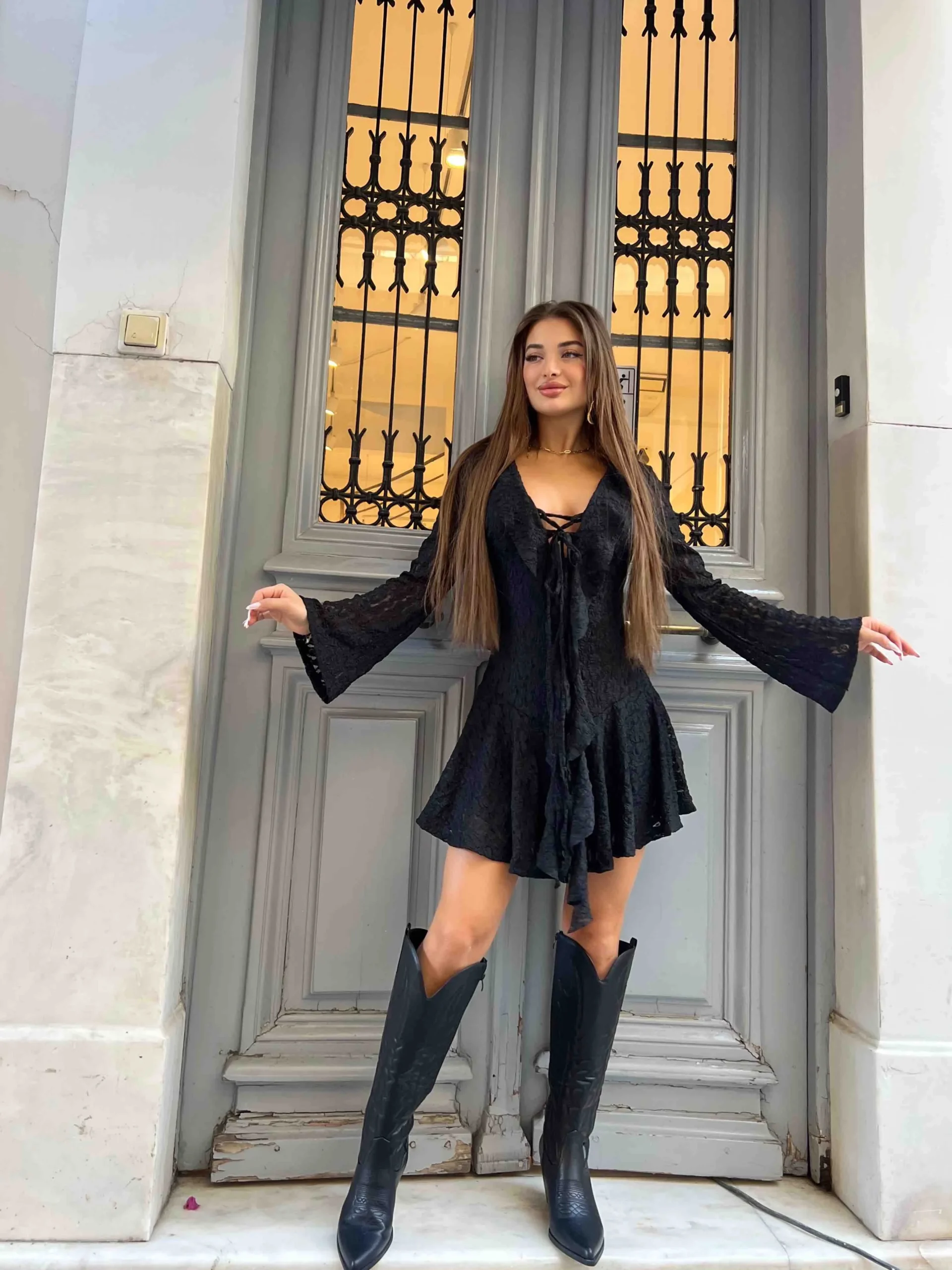 Μίνι δαντελένιο φόρεμα με βολάν, δέσιμο μπροστά και εντυπωσιακά μανίκια καμπάνα. Θηλυκό, ρομαντικό και σούπερ σικάτο — ιδανικό για βραδινές εξόδους αλλά και στιλάτες εμφανίσεις με cowboy boots.