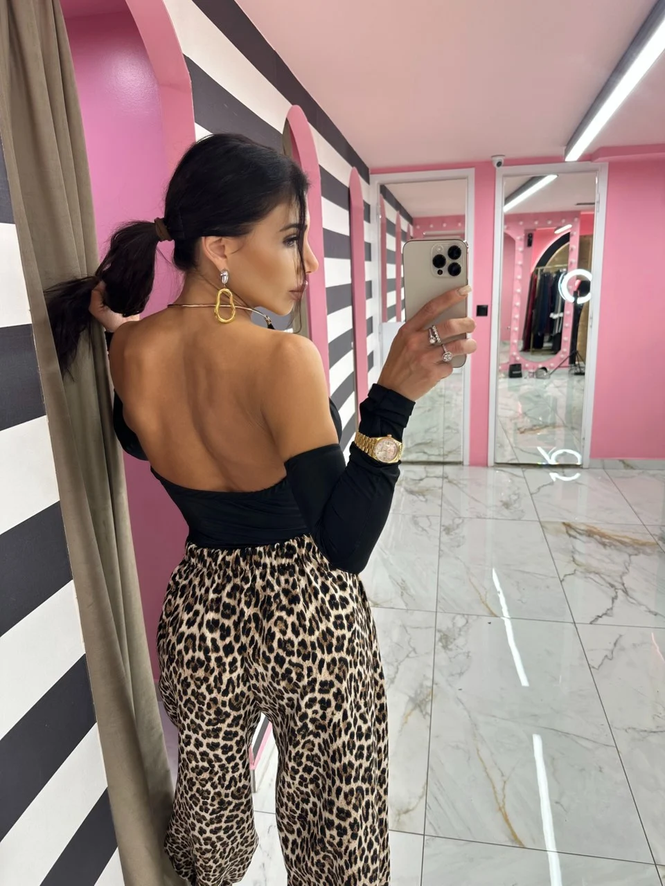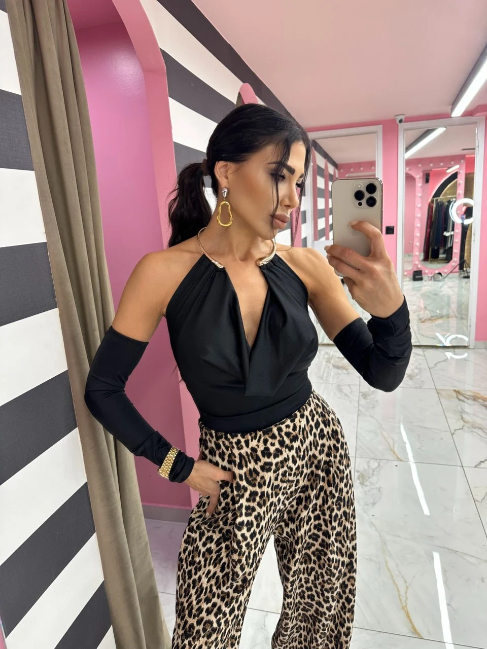 Μαύρο κορμάκι που αποπνέει αισθησιασμό και κομψότητα. Το άνοιγμα στο ντεκολτέ και τα μανίκια τύπου γαντιού δημιουργούν ένα σαγηνευτικό look που δεν περνά απαρατήρητο.
