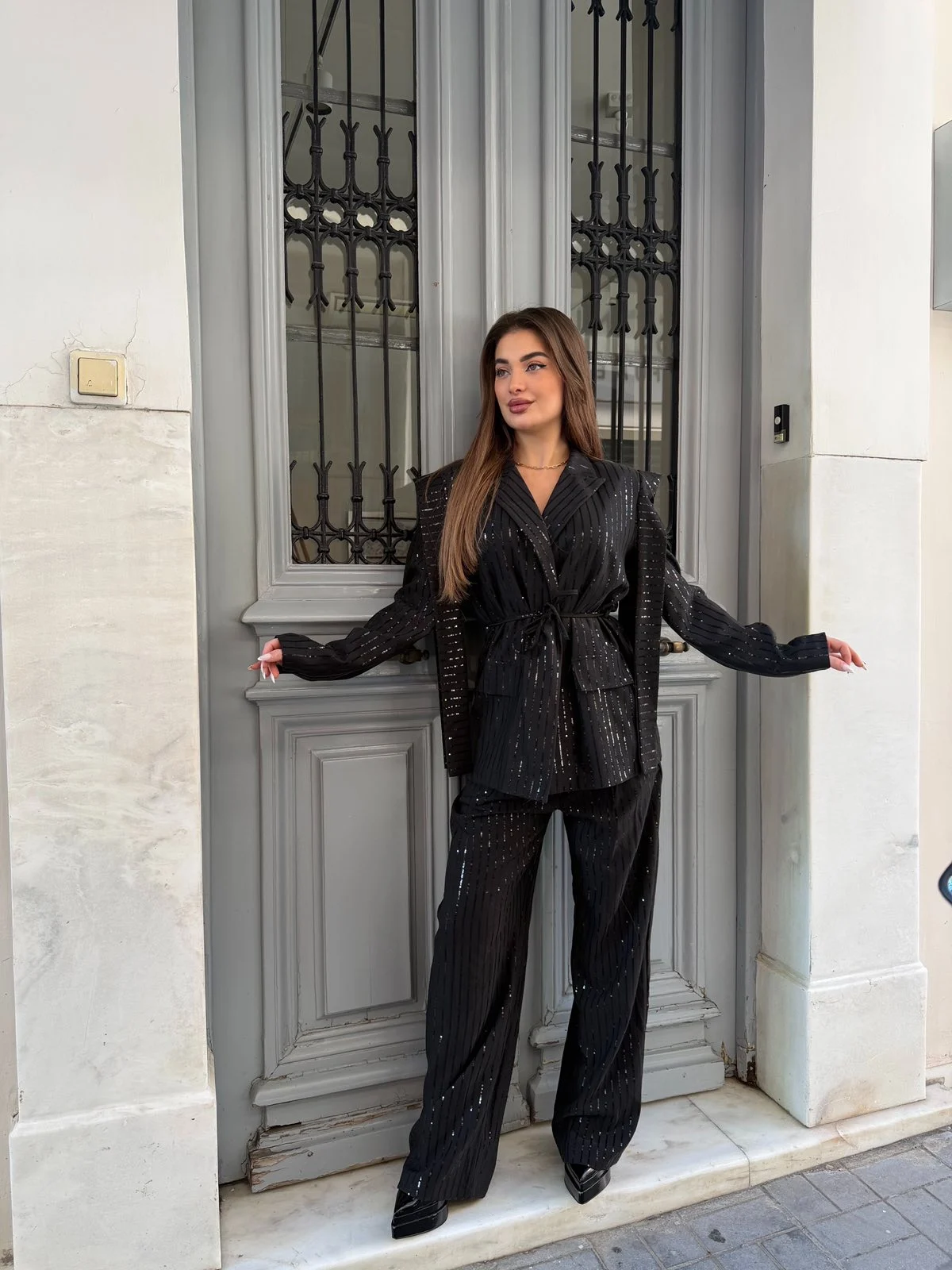 Κλασικό μαύρο κοστούμι με μοντέρνα λάμψη από τις διακριτικές μεταλλικές ρίγες. Το σακάκι δένει στη μέση για απόλυτα θηλυκή εφαρμογή, ενώ το γιλέκο δίνει fashion χαρακτήρα. Το παντελόνι προσφέρει άνεση και κομψότητα, κάνοντας το σύνολο ιδανικό για βραδινές εξόδους και statement εμφανίσεις.