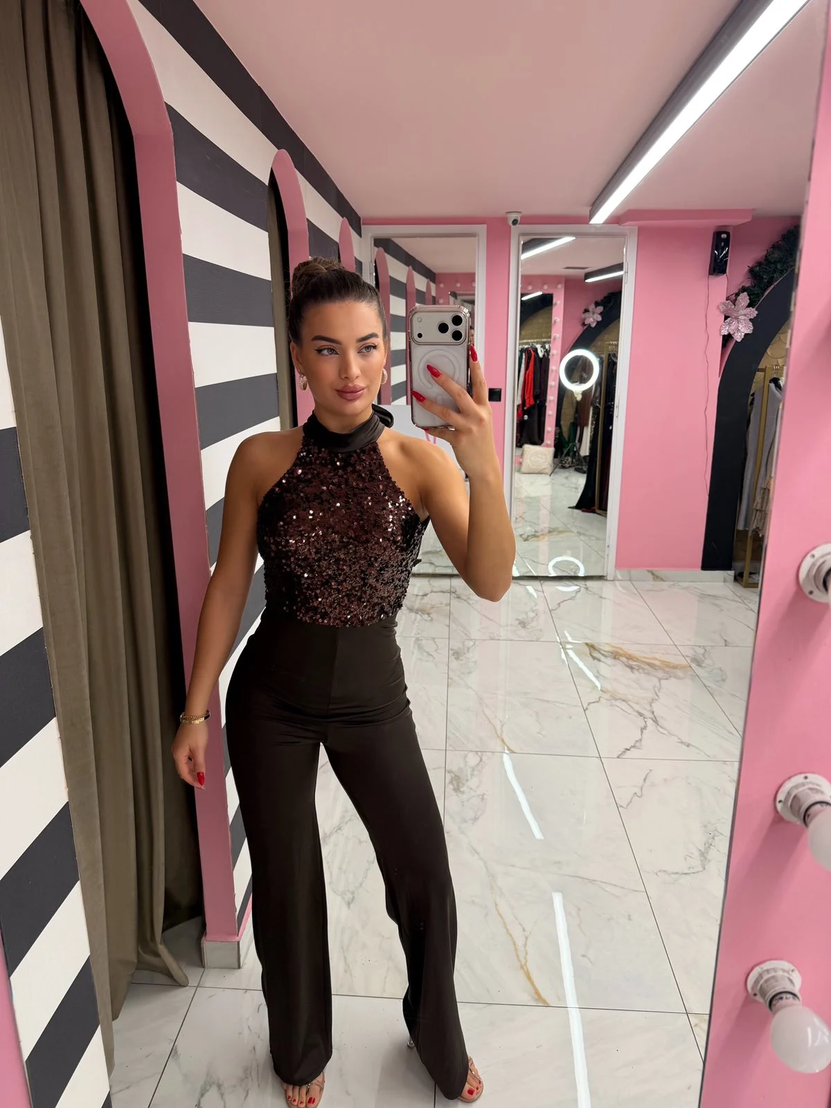 Stylish jumpsuit με halter λαιμόκοψη και διακριτικές παγιέτες που χαρίζουν ζεστή λάμψη. Η ψηλόμεση γραμμή και η άνετη παντελόνα αγκαλιάζουν το σώμα, προσφέροντας θηλυκό και sofisticé αποτέλεσμα για κάθε ιδιαίτερη περίσταση.