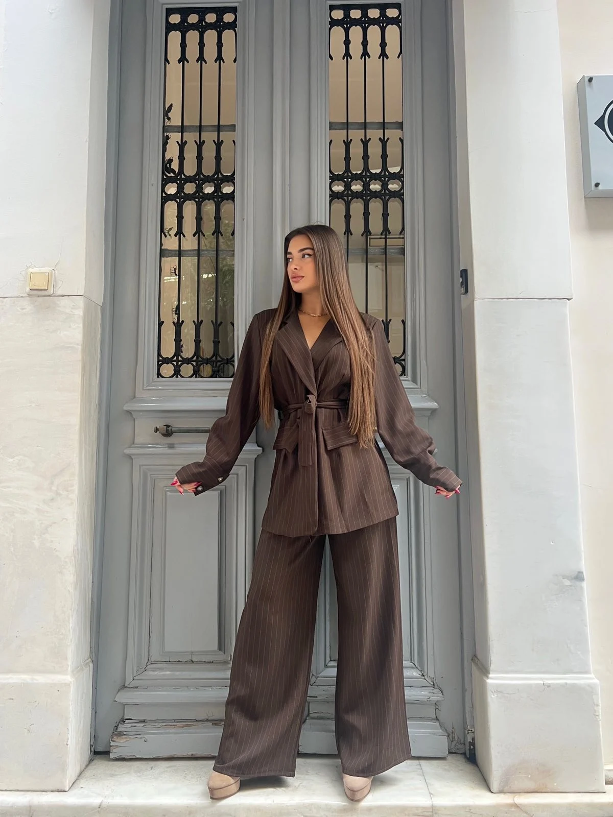 Κοστούμι σε ζεστή καφέ απόχρωση με ρίγες και ζώνη στη μέση.