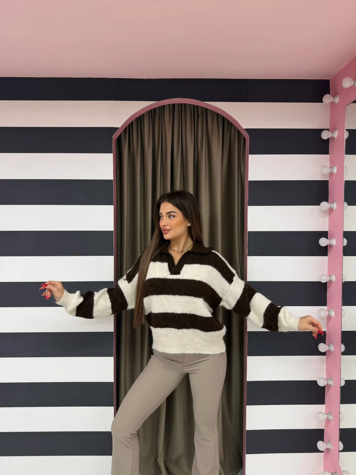 Πουλόβερ με καφέ ριγέ μοτίβο, εξαιρετικά μαλακή υφή και cozy fall vibes. Διαθέτει χαλαρό γιακά και άνετη εφαρμογή που ταιριάζει σε κάθε σωματότυπο.