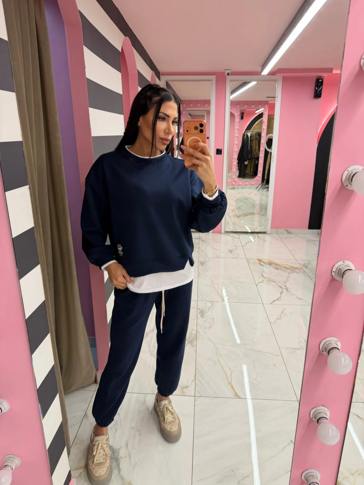 Άνετο καθημερινό σετ σε βαθύ navy χρώμα, ιδανικό για όλη τη μέρα. Μαλακό φούτερ με χαλαρή γραμμή και παντελόνι με λάστιχο που εφαρμόζει τέλεια χωρίς να πιέζει. Το απόλυτο basic που συνδυάζεται με sneakers και δίνει effortless street style vibes.