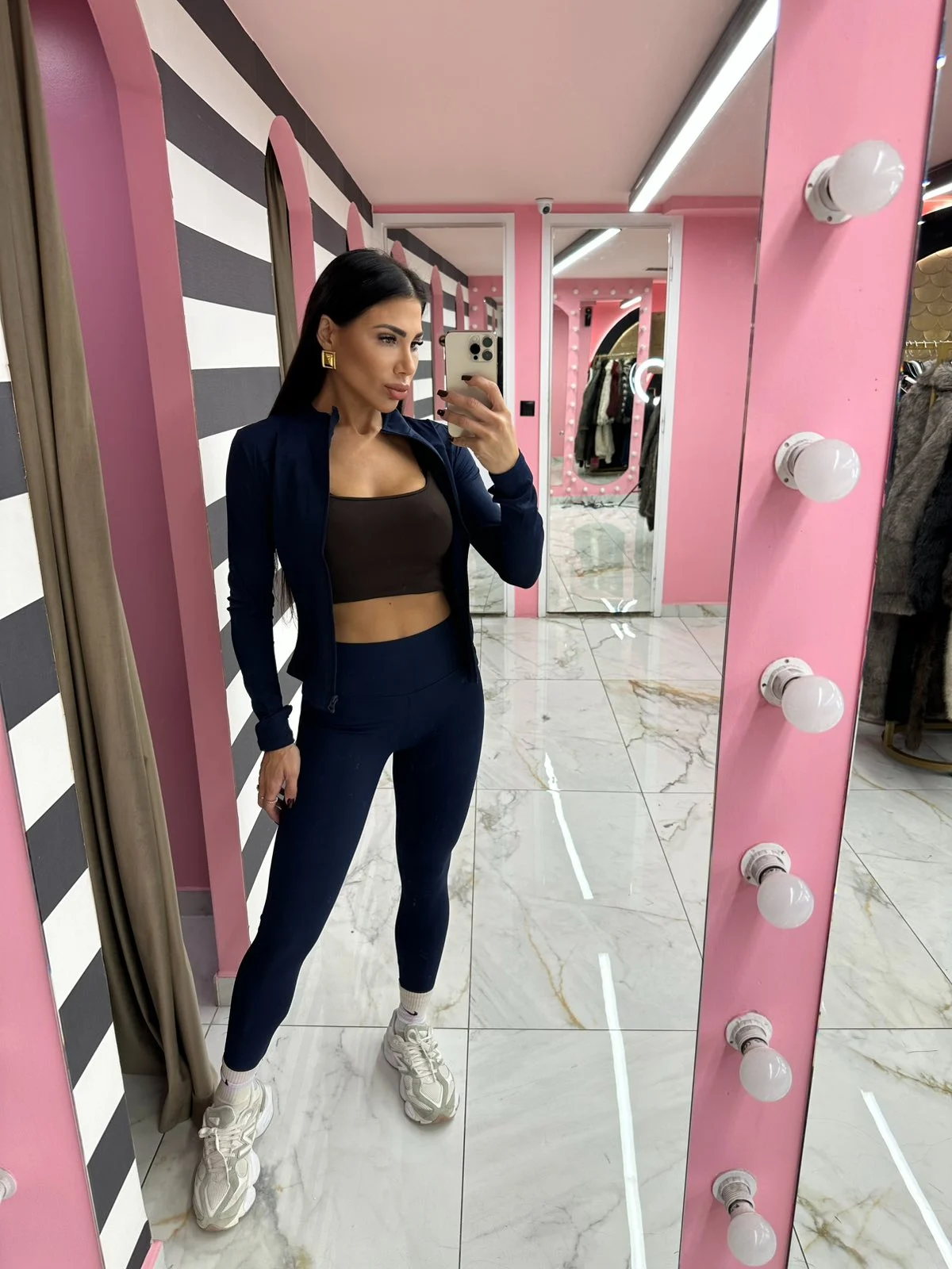 Μπλε σκούρο αθλητικό σετ από ελαστικό ύφασμα υψηλής ποιότητας, με push-up κολάν και φερμουάρ στη ζακέτα. Συνδυάζει κομψότητα και άνεση για κάθε στιγμή της ημέρας.